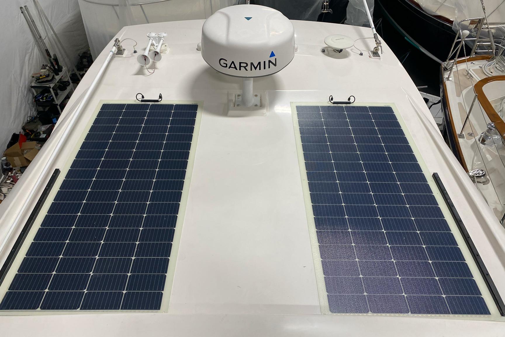 For extended time on a mooring or at anchor, the vessel is equipped with an expanded AGM house battery bank and 400W solar array (installed in 2024), allowing continued operation of the refrigerator and other DC systems without relying heavily on the generator. Additional updates include a new Isotherm fridge (2024), new cockpit upholstery (2023), and a new Hurley davit system (2024).