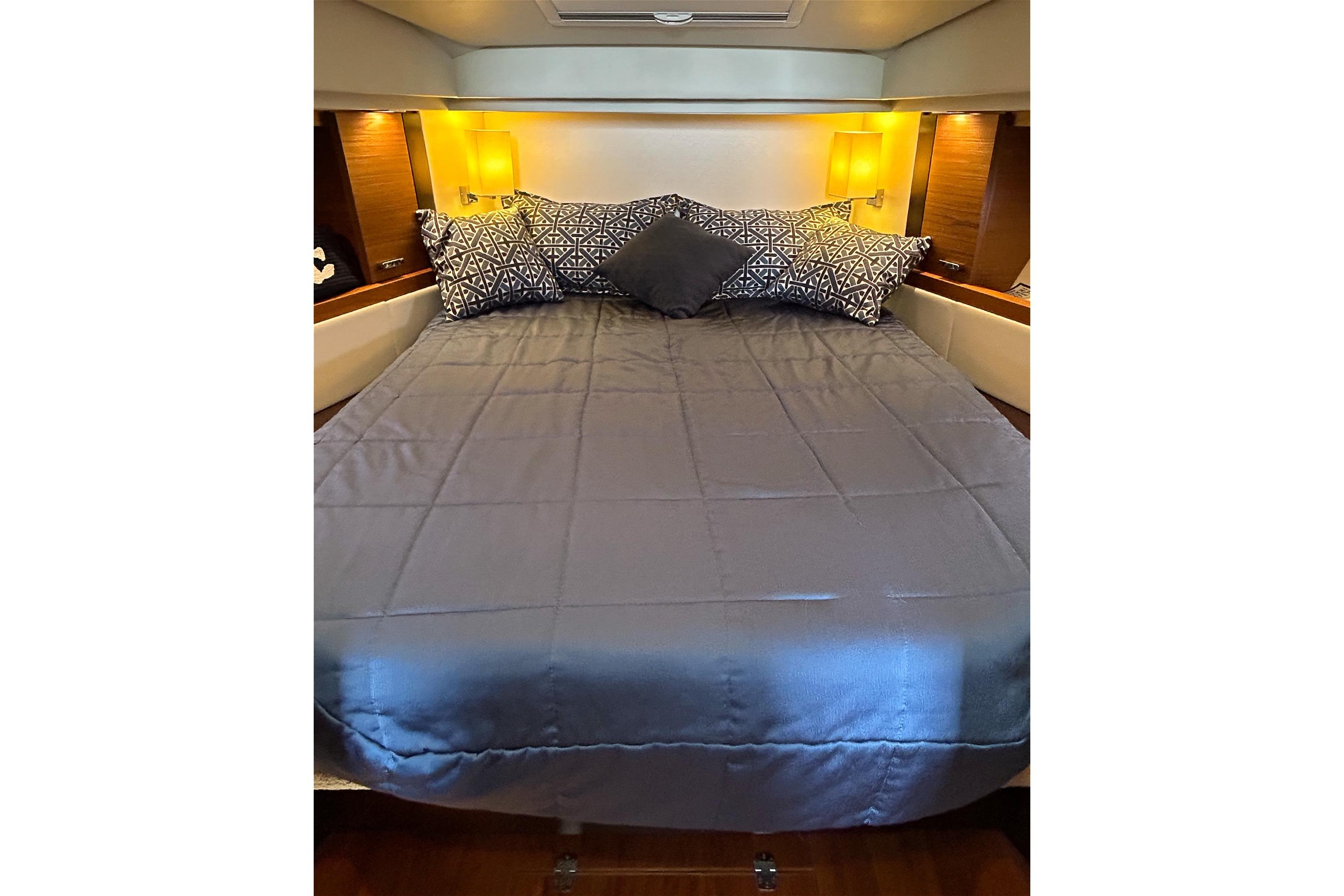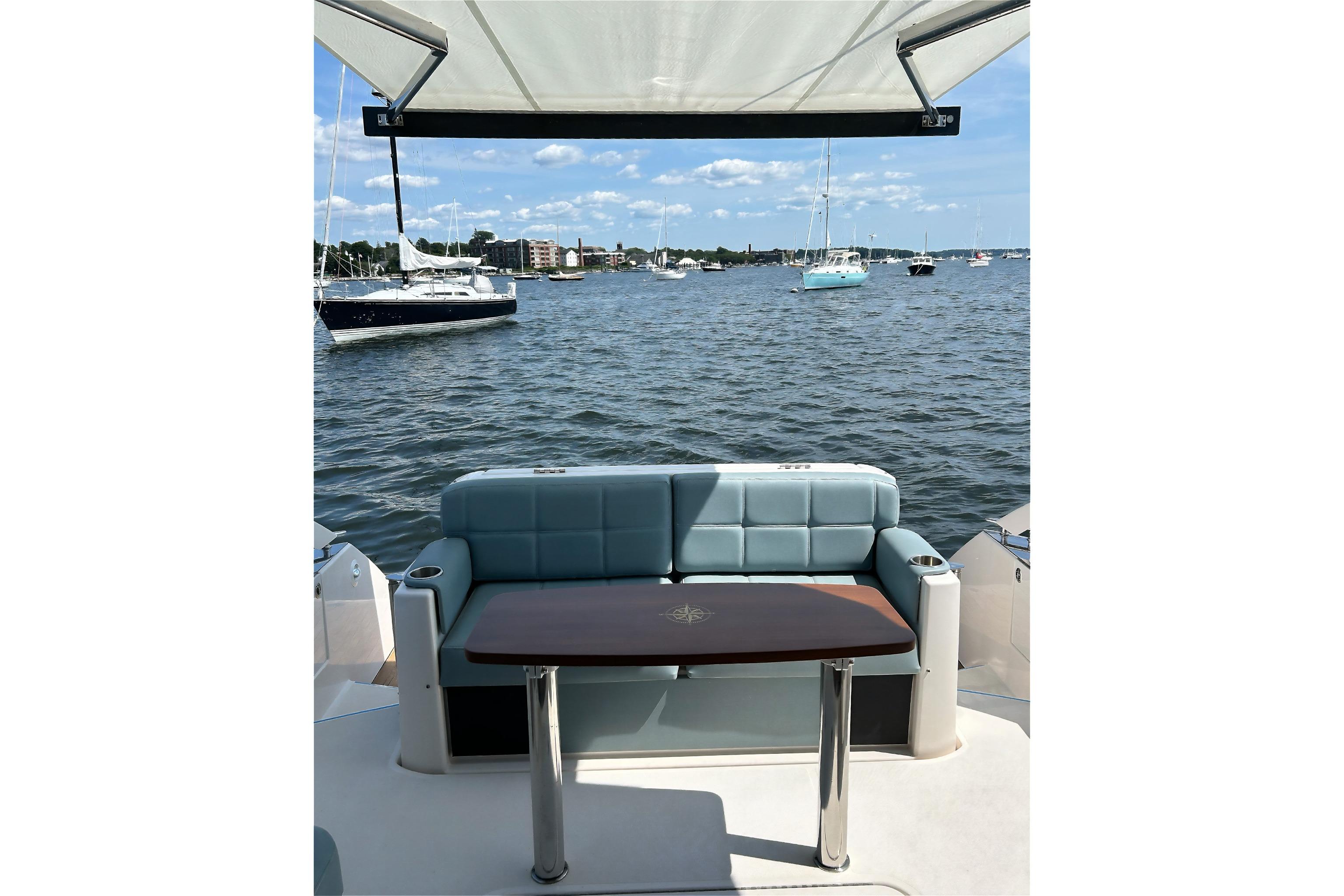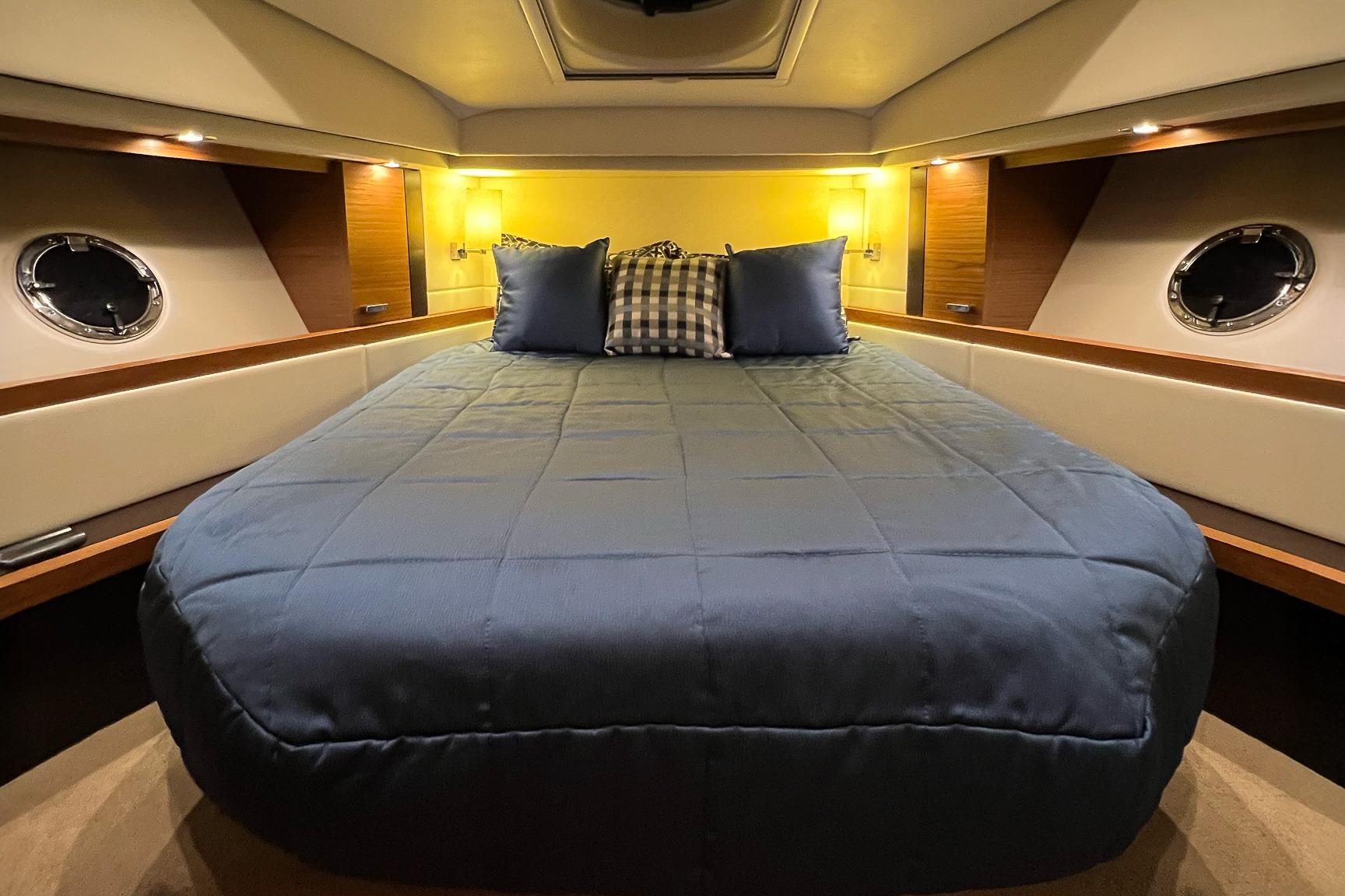 The 39 Coupe offers a practical two-stateroom layout, a bright salon with large windows and retractable sunroof, and an integrated galley. The salon connects directly to the cockpit, and a large swim platform provides access to a spacious trunk storage compartment. Garmin navigation electronics and joystick docking make the boat accessible for owner-operators.