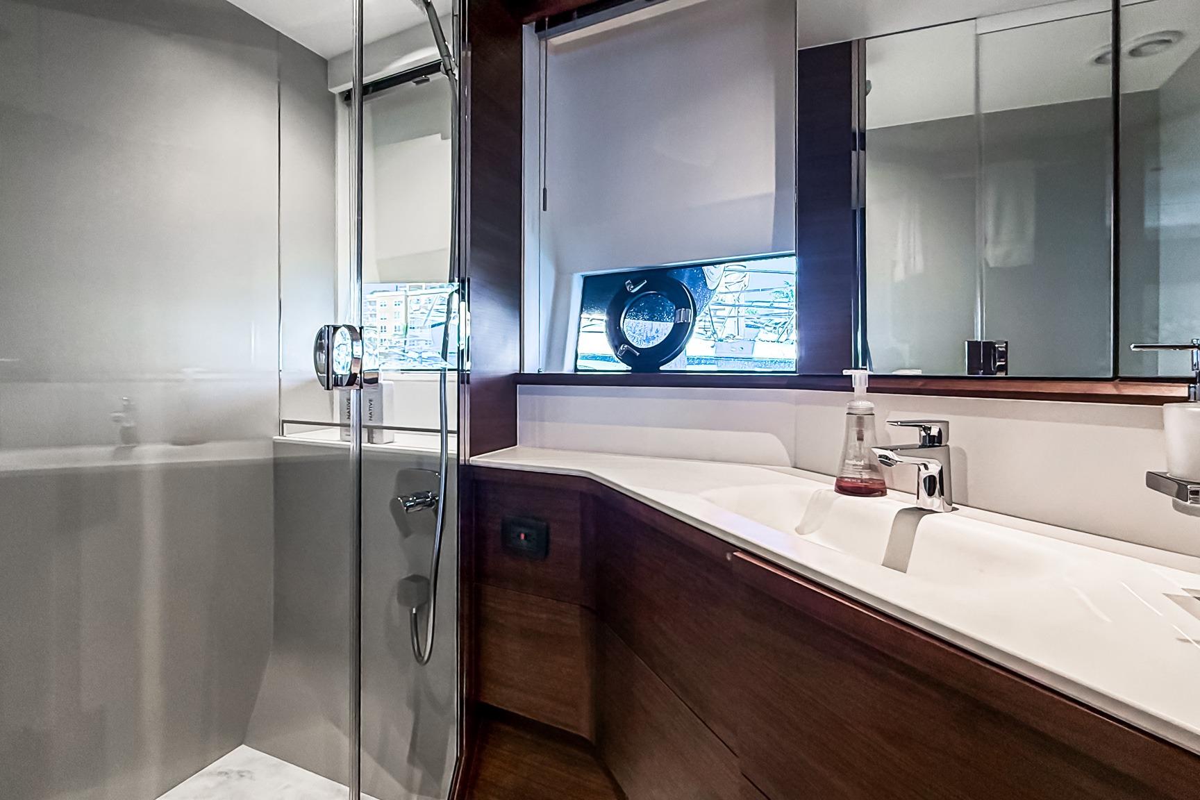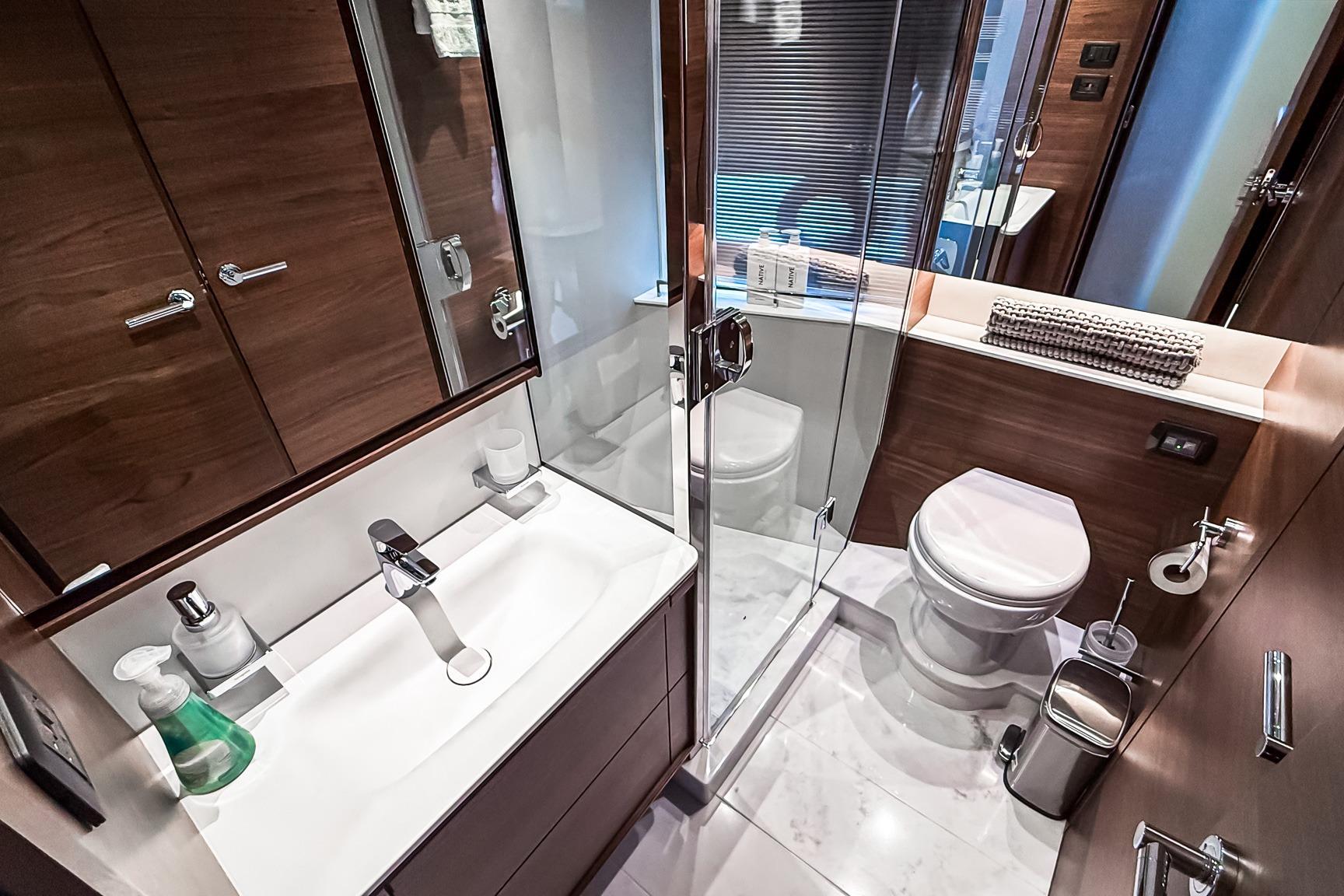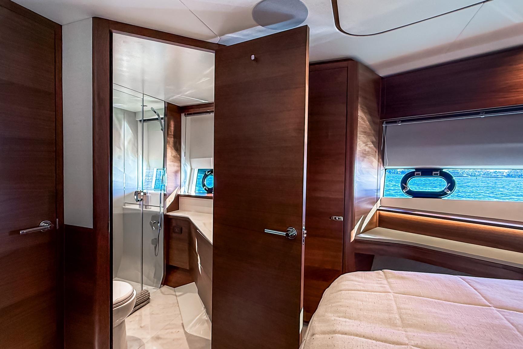 Configured with twin berths, this cabin includes an electric sliding mechanism allowing it to convert to a double berth at the touch of a button. It shares the starboard head, which doubles as a convenient day head.