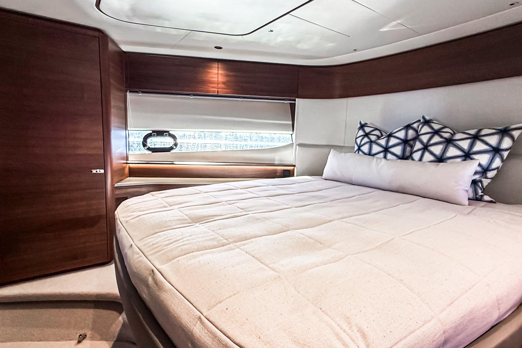 The full-beam owner’s suite is positioned amidships and bathed in natural light from large hull windows. It includes a private ensuite head, a spacious wardrobe, a seating area, and abundant storage. High-end finishes and premium audio/video upgrades complement the refined atmosphere.
