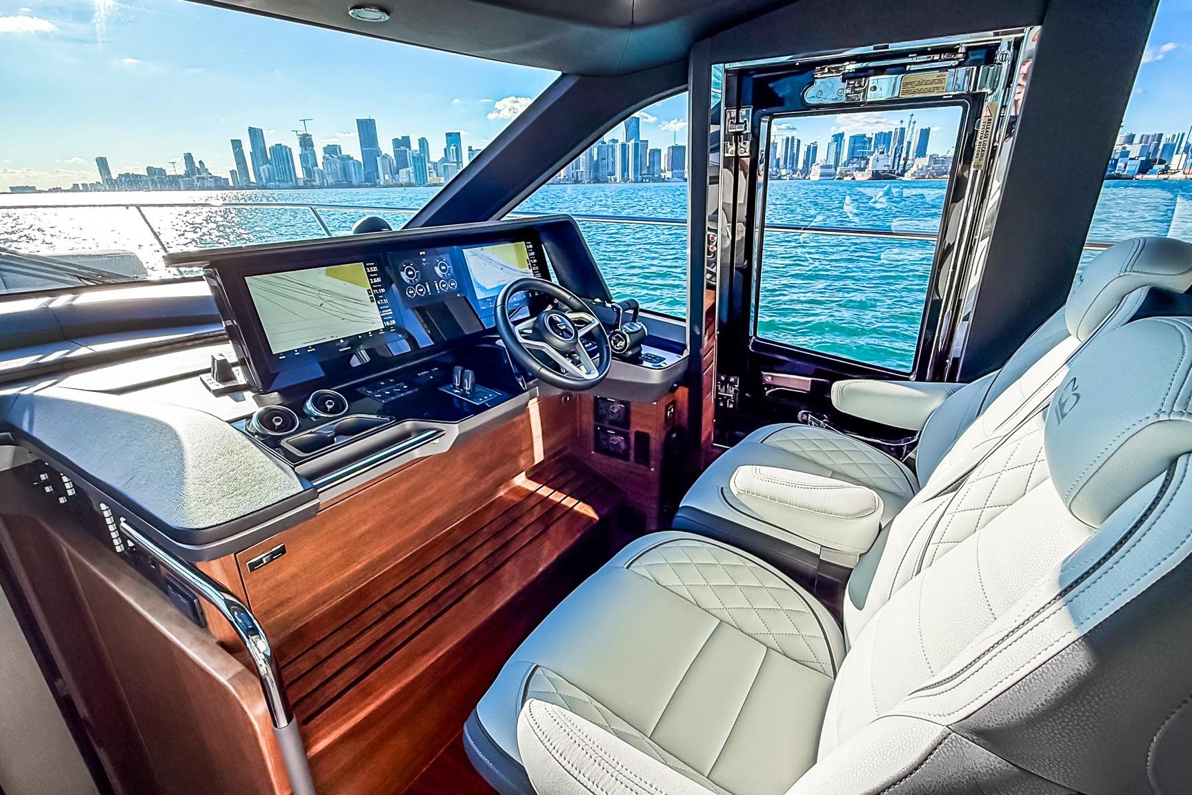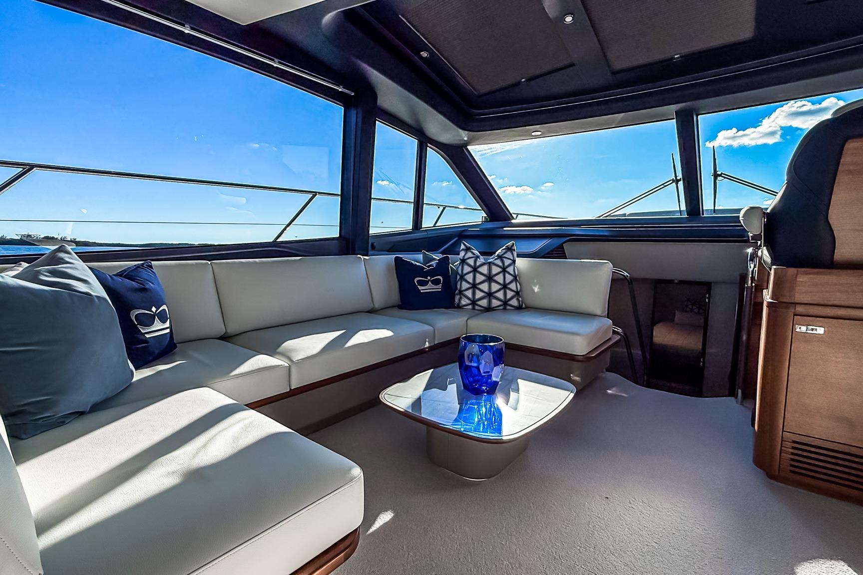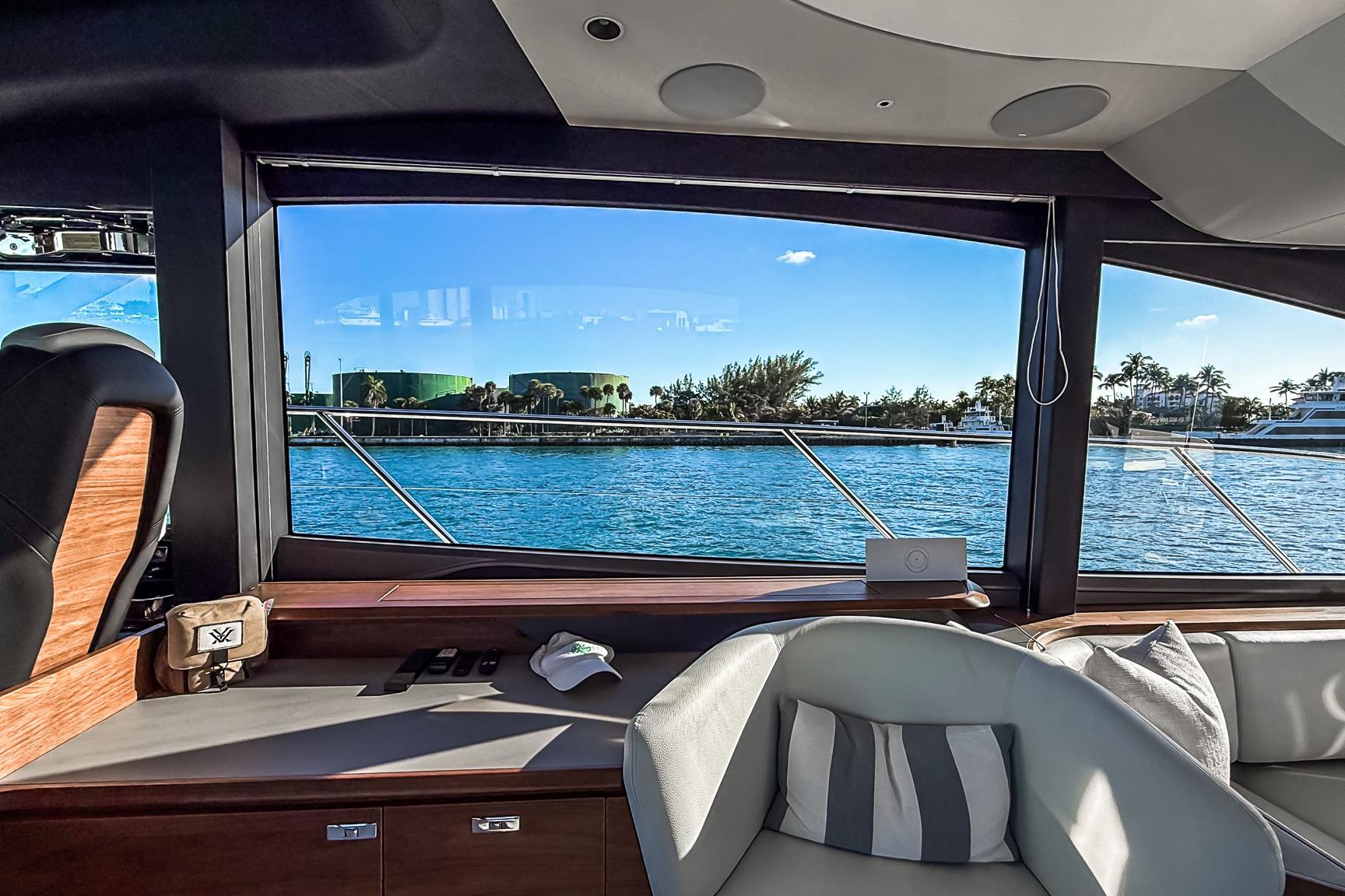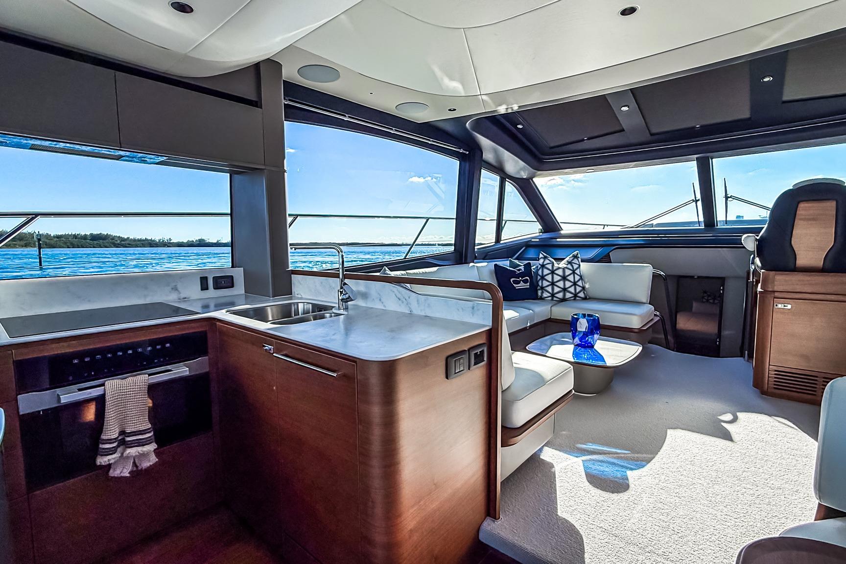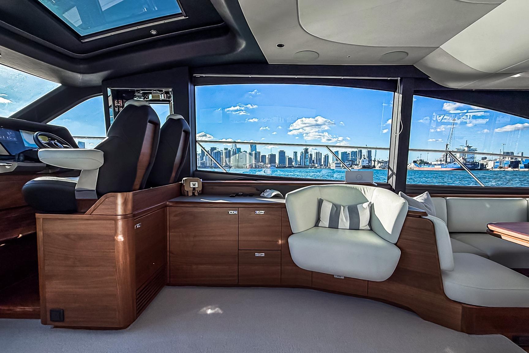The Princess S65 Sportbridge offers a spacious, contemporary interior layout designed for both extended cruising and luxurious onboard living. The interior features beautiful walnut wood in satin finish, and large windows, an open-plan salon, and a well-appointed galley create a bright, seamless social environment connecting the main deck with the outdoor spaces.