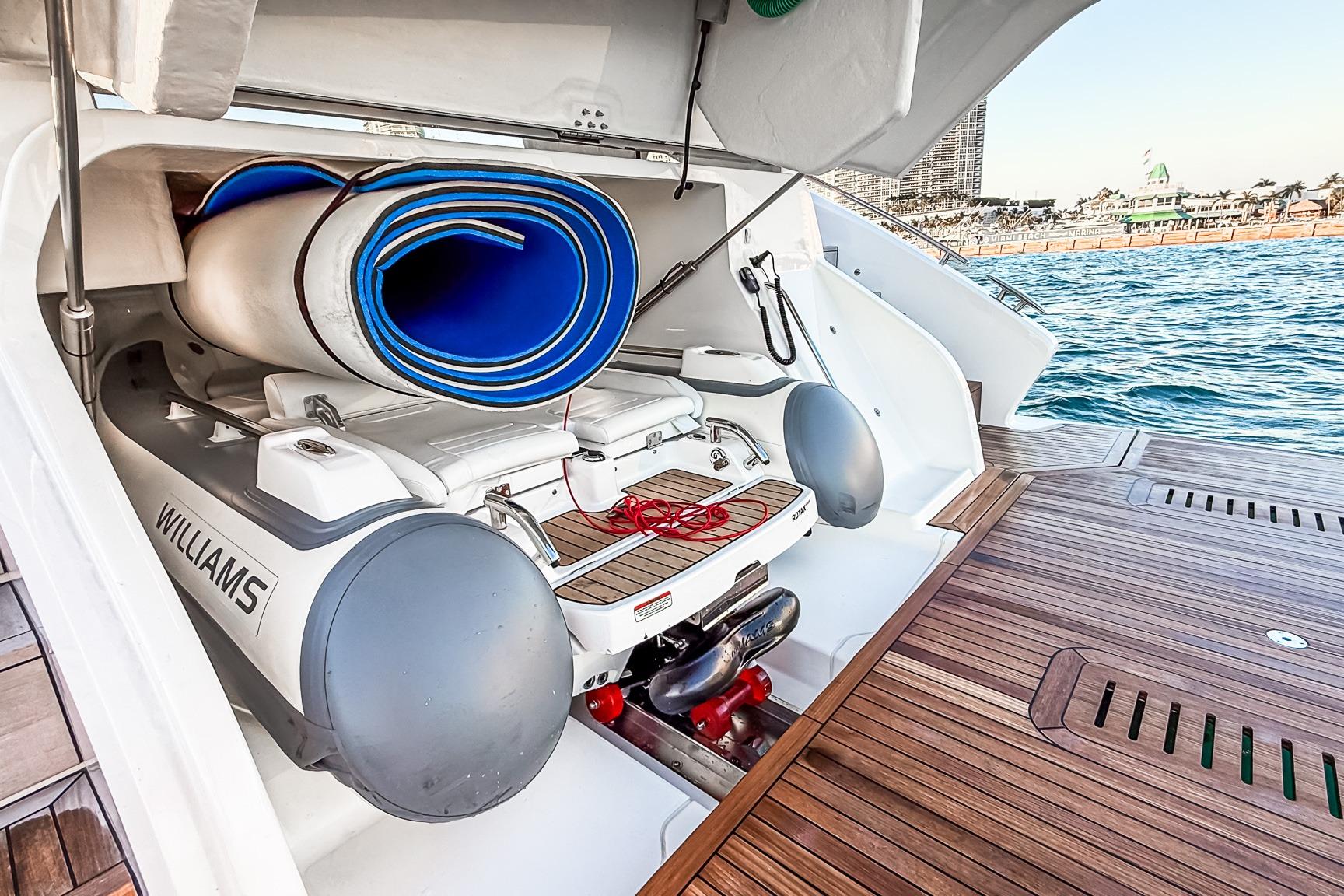 The S65 has an up/down electro hydraulic transom platform with 1,212 lbs SWL capacity fitted as standard however, if a tender is being carried in the garage (up to 10'9") it is recommended that the combined weight of tender and additional PWC be no greater than 1,102 lbs when underway.