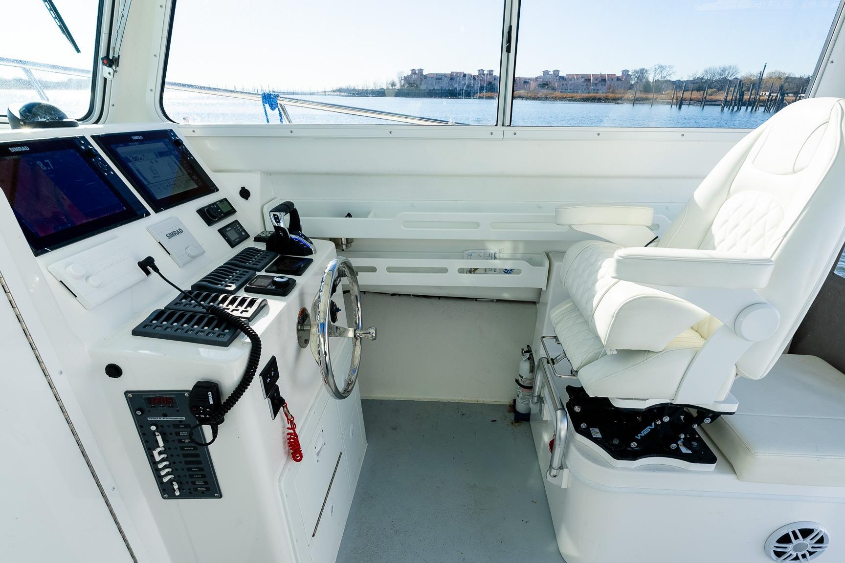 Inside the pilothouse, the helm sits to starboard with matching shock-absorbing captain’s chairs on both sides and bench seating aft. The pilothouse is designed for heavy-duty use, offering abundant gear and tackle storage throughout.