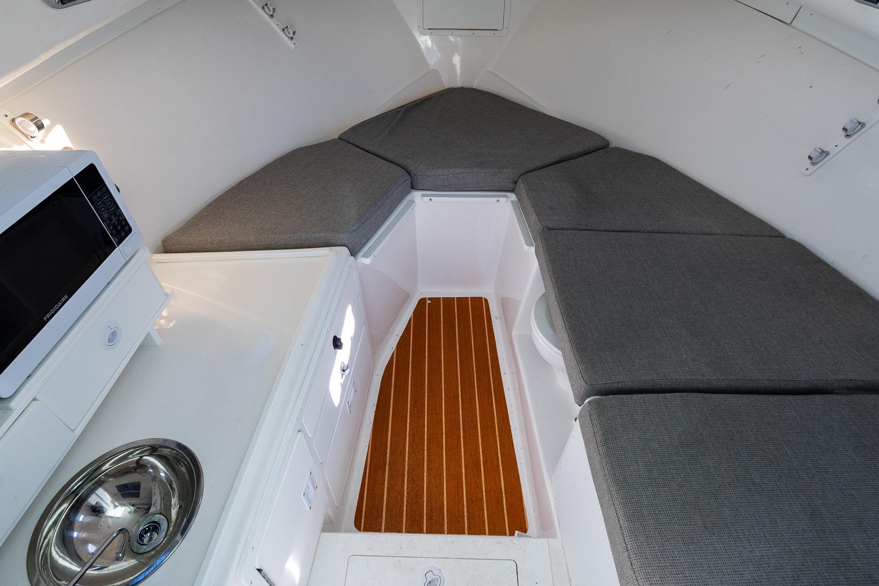 Below, the cabin has been intentionally simplified for anglers—Steiger enlarges the berth by removing the enclosed head typically found on the 31DV. A marine head remains installed, along with fans, LED lighting, and storage.