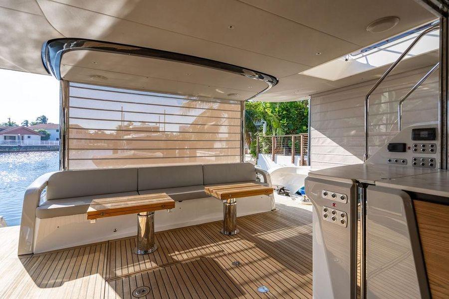 Outdoor spaces are thoughtfully designed for gathering and relaxation. The hydraulic swim platform creates seamless access to the water, while the fully air-conditioned beach club—with shower, convertible double bed, refrigeration, and dedicated stereo—offers a private retreat just steps from the sea. Teak bridge flooring and dual electric teak cockpit tables with folding wings enhance alfresco dining, complemented by multiple entertaining areas including wet bars with sink, stainless refrigerator, BBQ, Corian countertops, wine cooler, and ice maker. Electric privacy sunshades, underwater lights, stainless steel anchor and railings, and integrated hardtop lighting further elevate the experience.