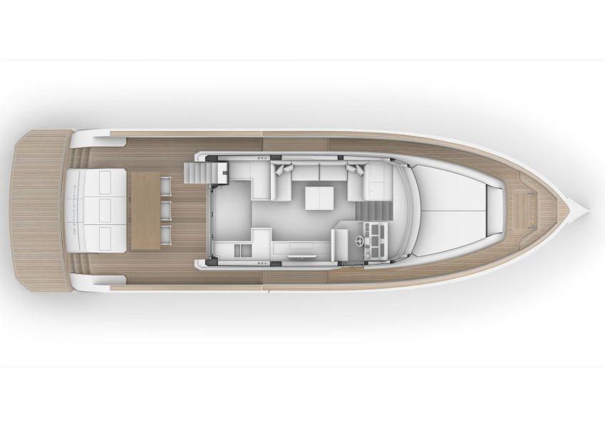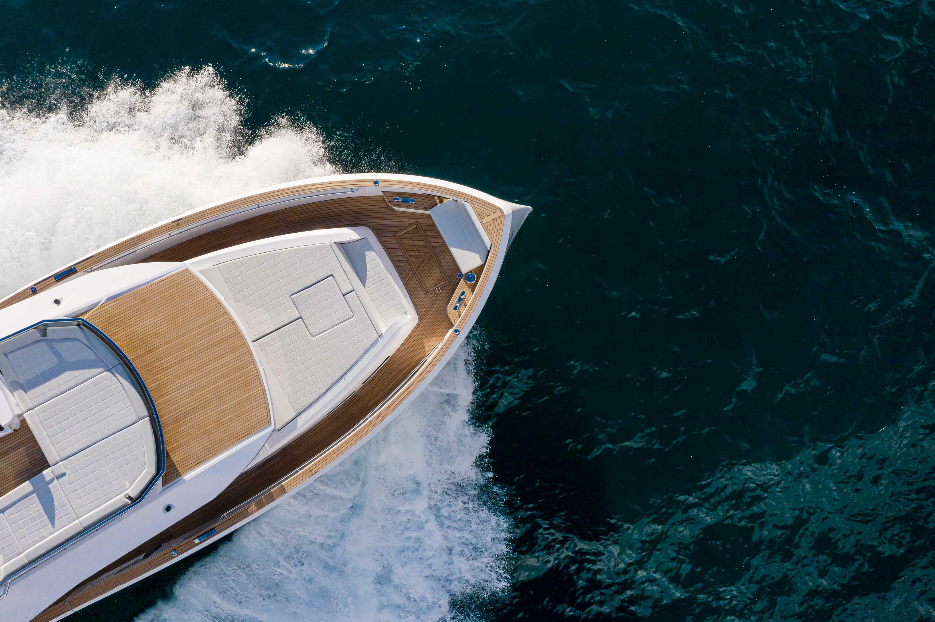The style of the interior accommodations is fresh and bright, combining white lacquers with a blond teak. The continuity between interior spaces and the exterior social areas is thanks to the large picture windows and the two collapsible side terraces. This allows an always open-air environment on board. Because true luxury is boundless freedom.