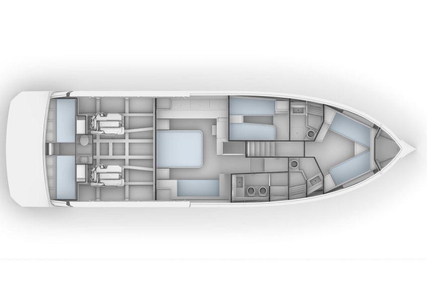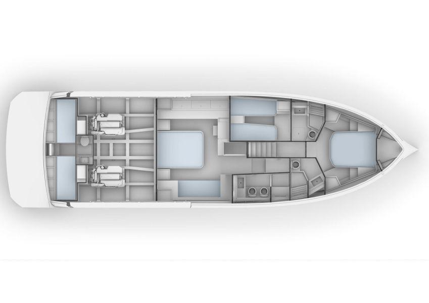The centrally positioned owner's suite takes advantage of the maximum beam of the boat. It is generous in size with elegant interiors, a sofa and spacious wardrobes. The VIP cabin with a private head is available in two versions with two single beds or one double bed. The crew cabin is positioned under the aft deck sunbed and is equipped with two beds and bathroom, and with direct access to the engine room.