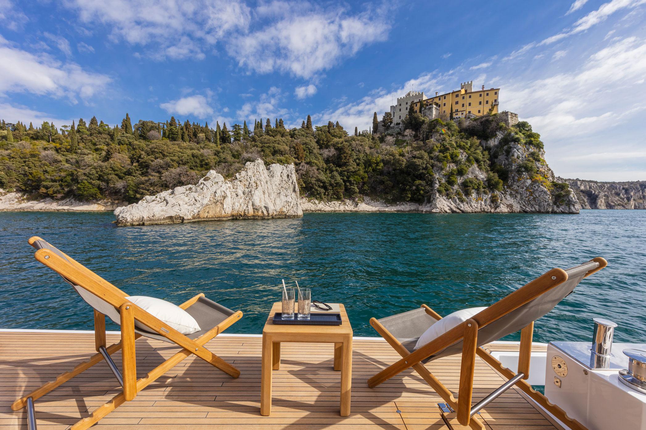 Close attention has been devoted to the livability and usability of the E60's main deck space. There are two fold-out side terraces that help create a beautiful veranda on the sea that measures 35 square feet! The stern also features a height-adjustable, hydraulic swim platform for convenient access to the water for swimming, diving, or loading on to a tender.