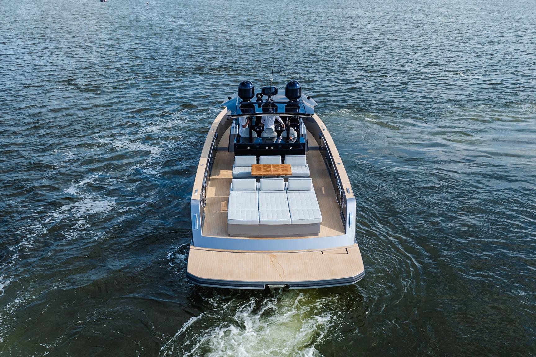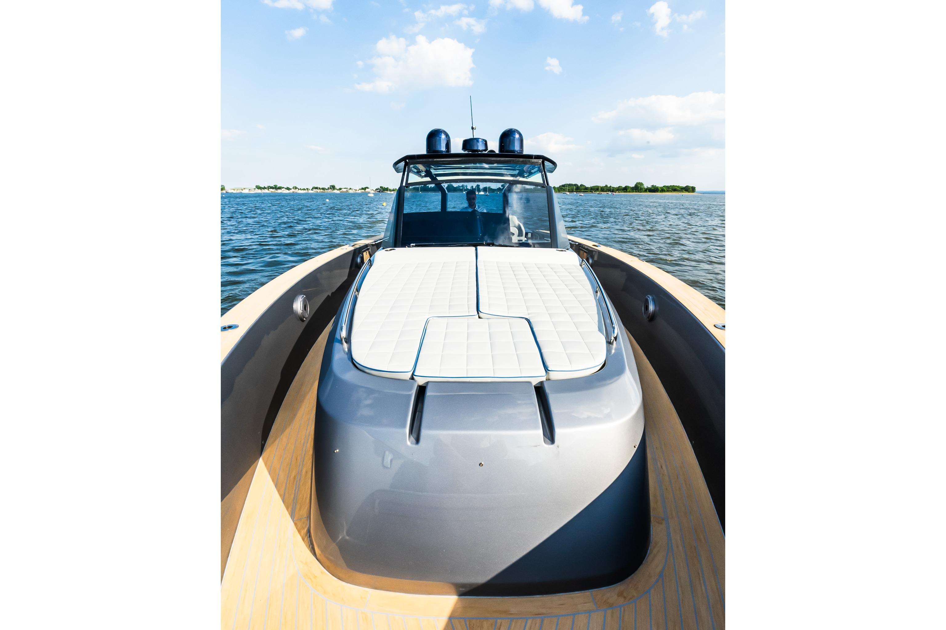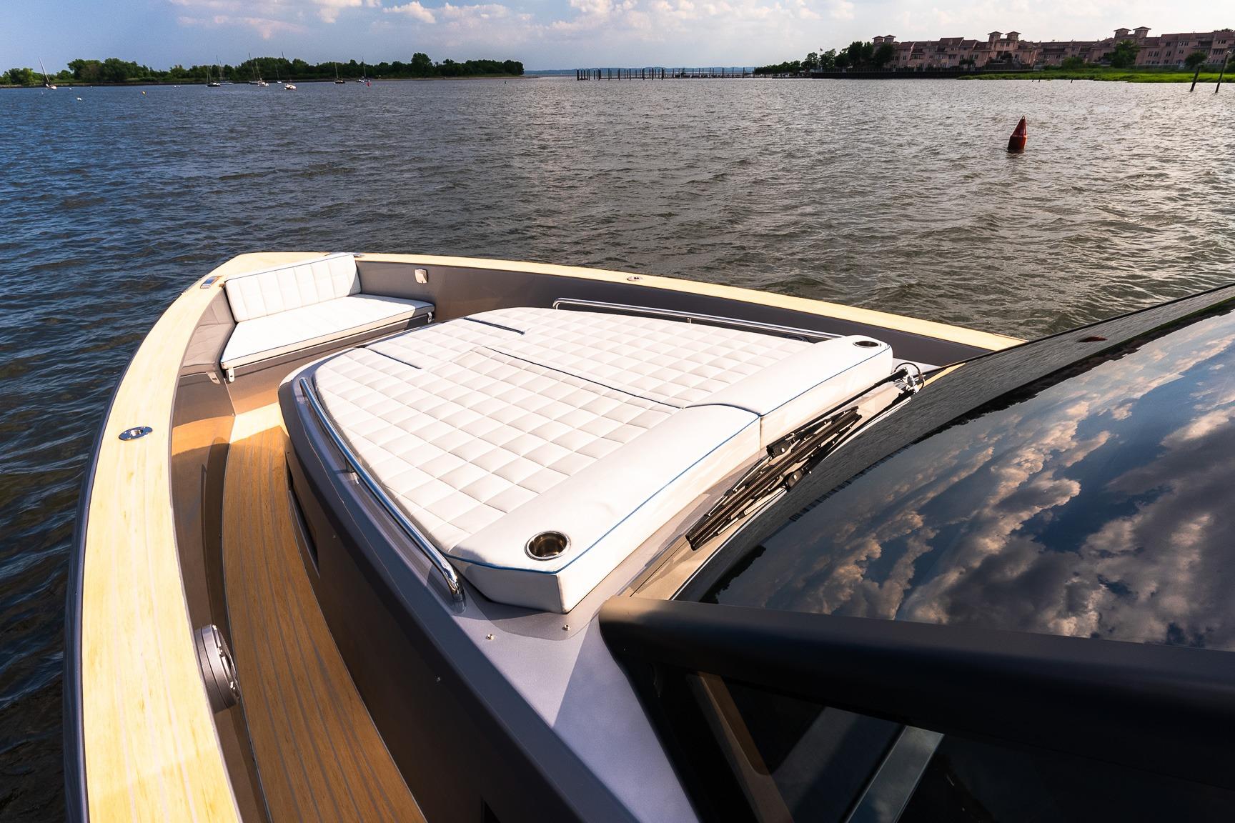 The walkaround design is one of the main advantages of the deck: it guarantees extra space and facilitates safe access to the bow sundeck. As in very large yachts, an optional longer stern platform can be used to step on or off board, take a swim, a shower outside or as an extra entertainment area equipped with mattresses, poufs or chaise lounges.
