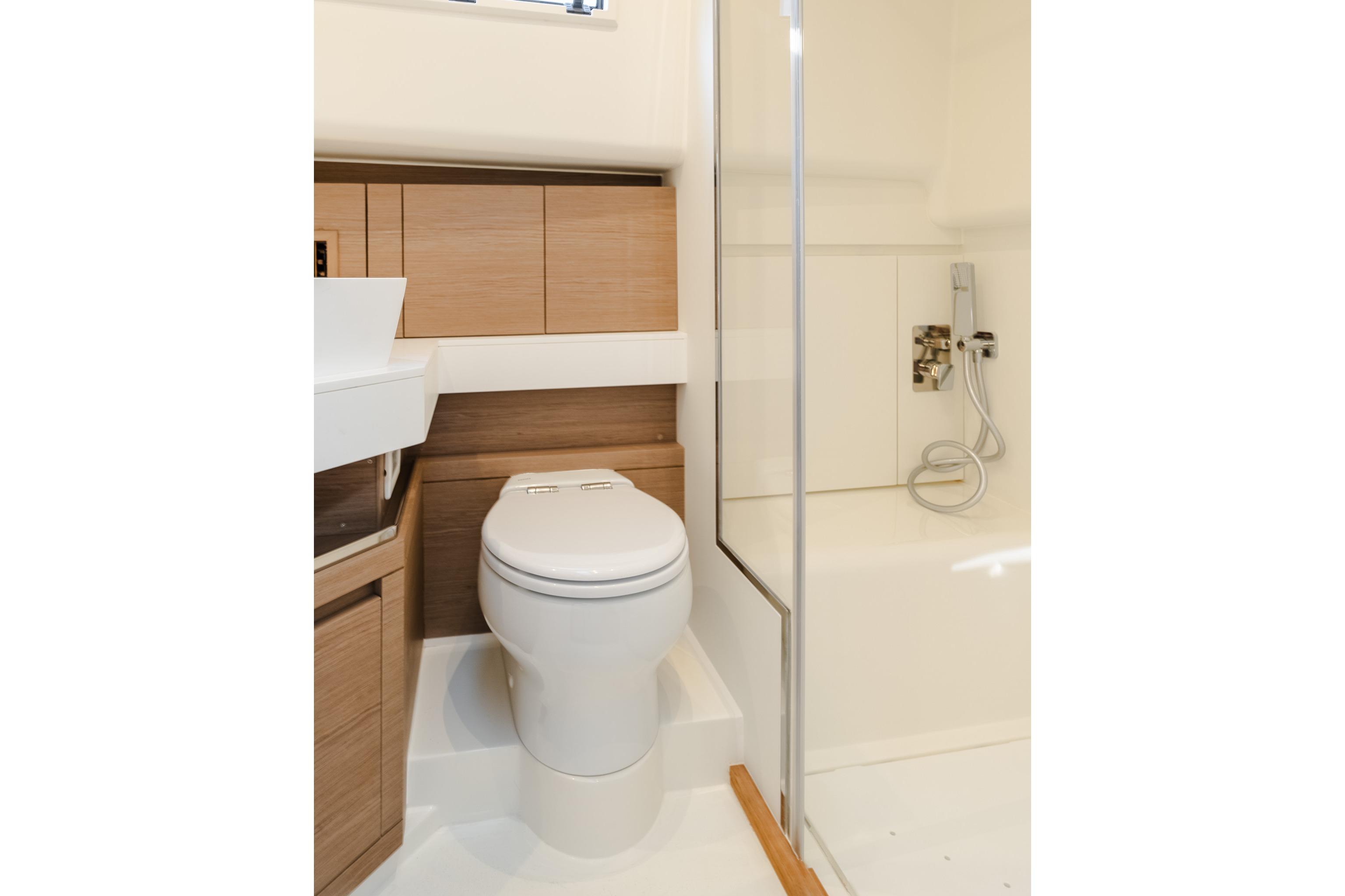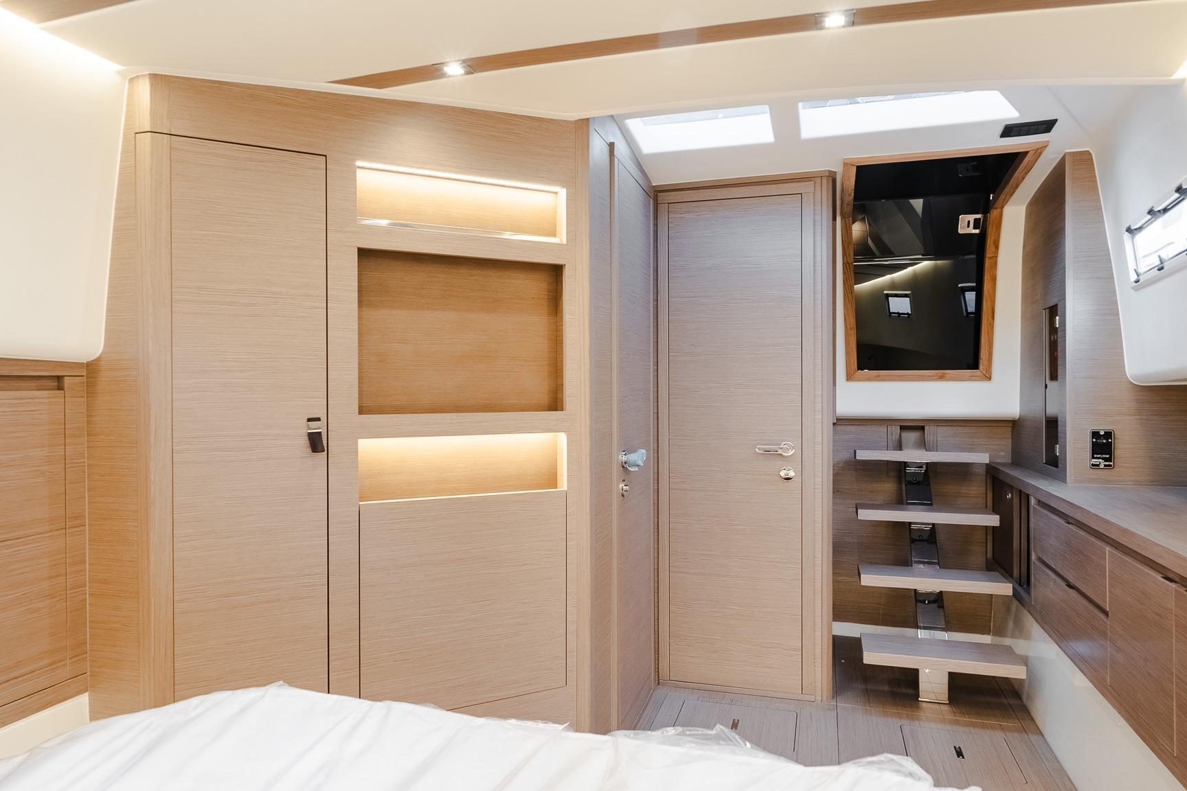 Its large hull volume and ample headroom make the Pardo 43’s interiors warm, welcoming, and spacious. The open space is made up of two large cabins; the owner’s cabin at the bow includes a generous bed, many storage areas, large closets and plenty of natural light. Aft, a wide storage area can be turned into a secondary cabin with two twin beds, closets and many storage areas. The passage between the two cabins is excellent. The head is located between the cabins and offers a separate spacious shower stall. The interior colors and materials can be fully customized.