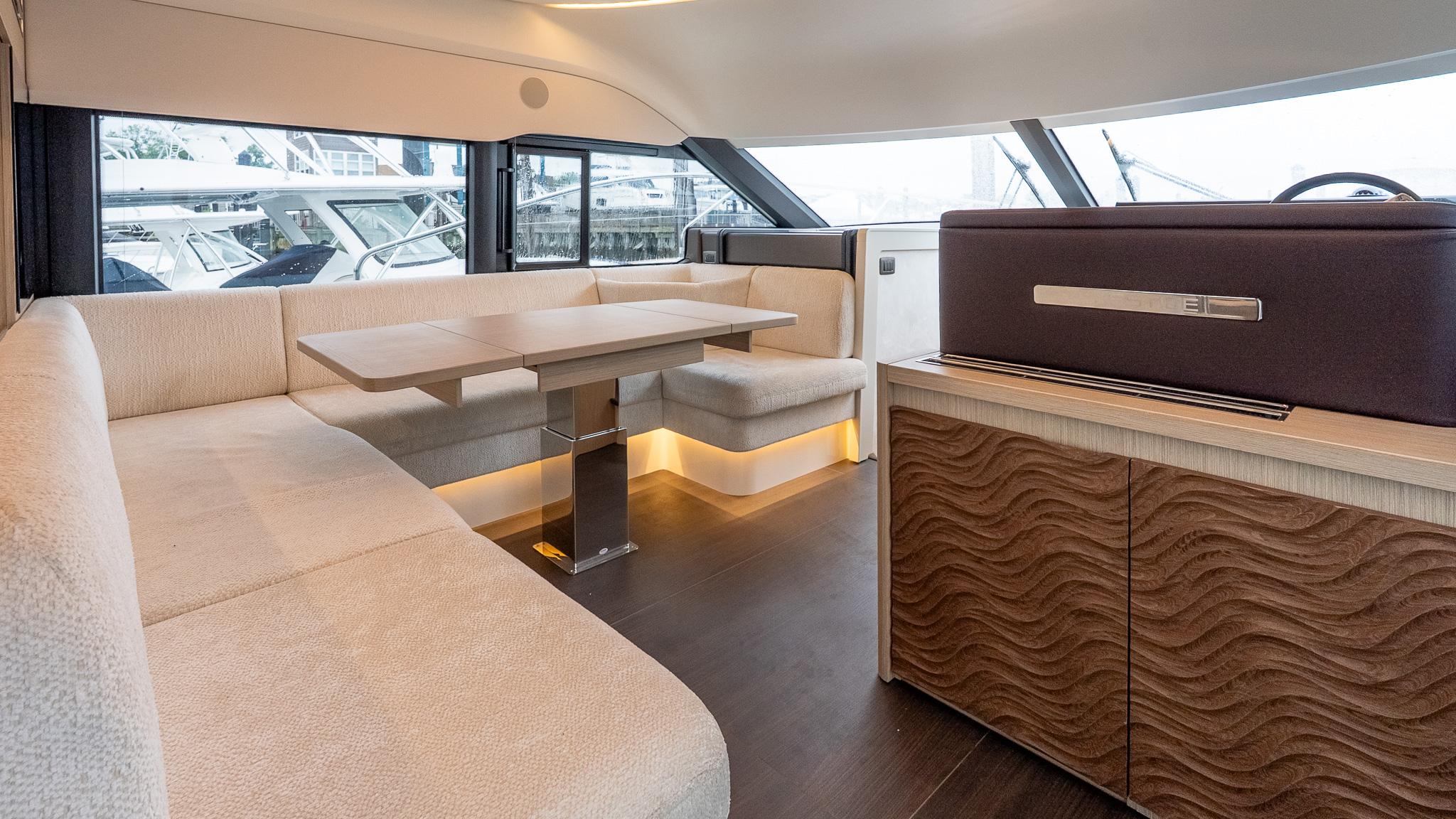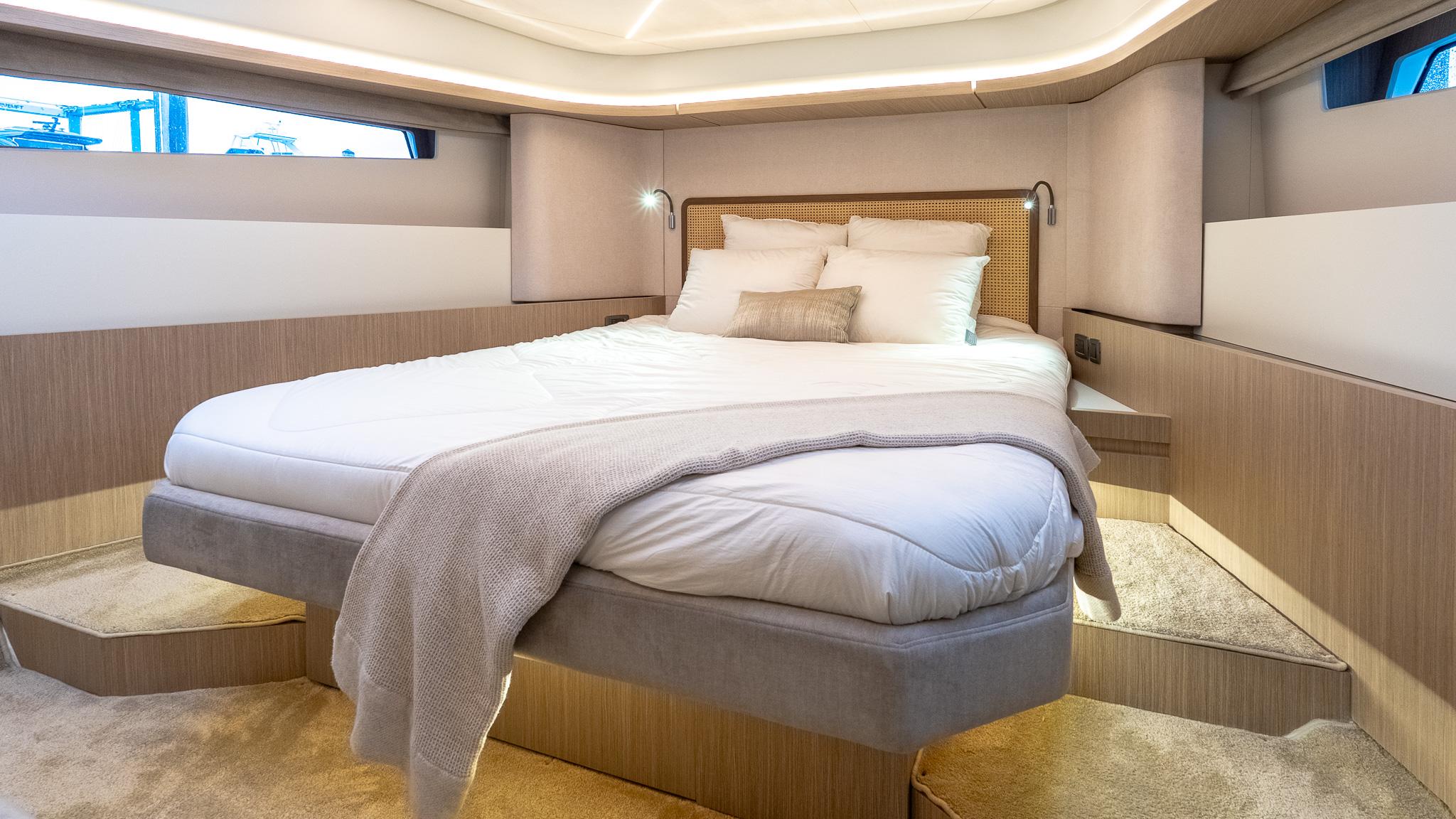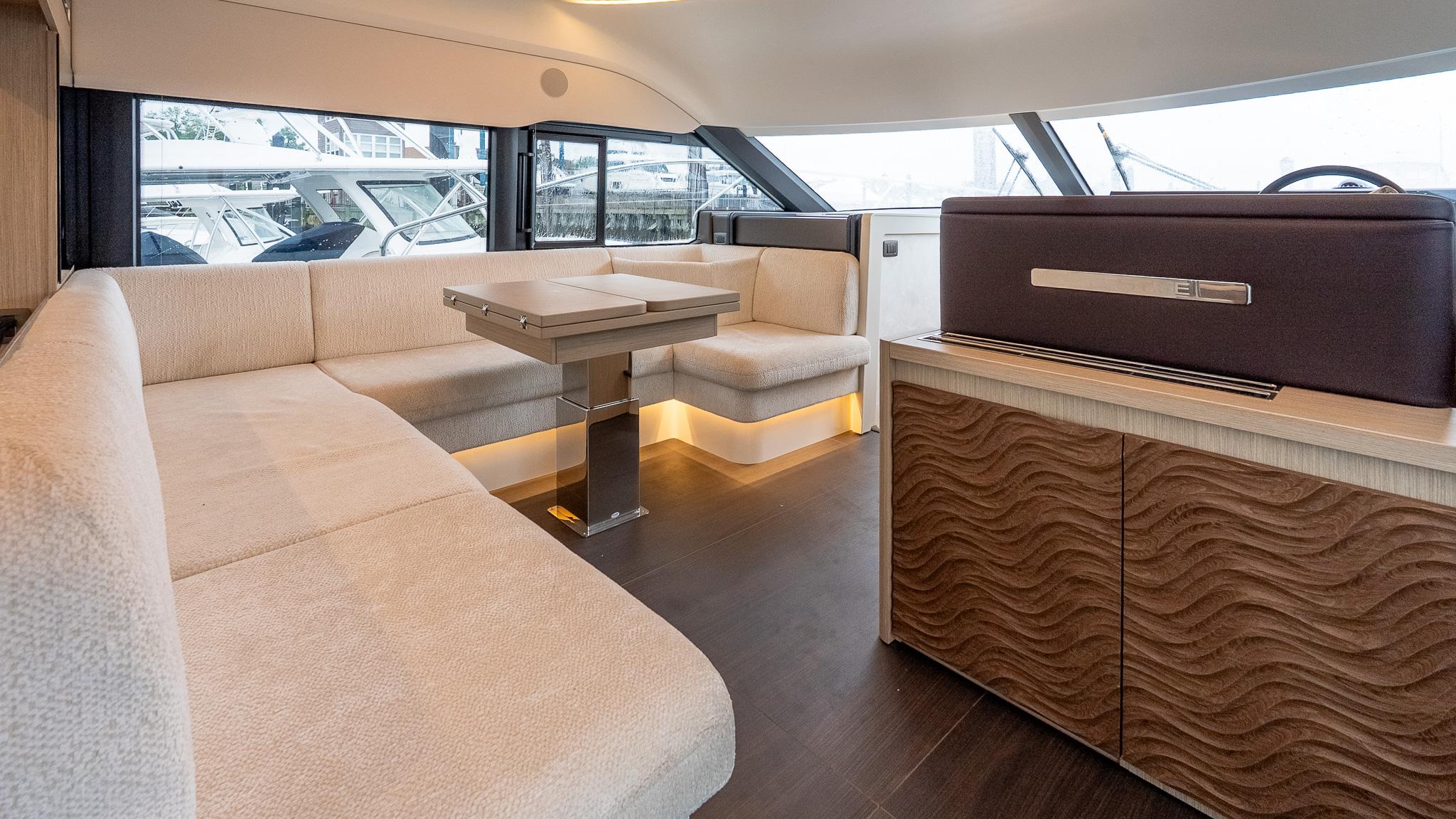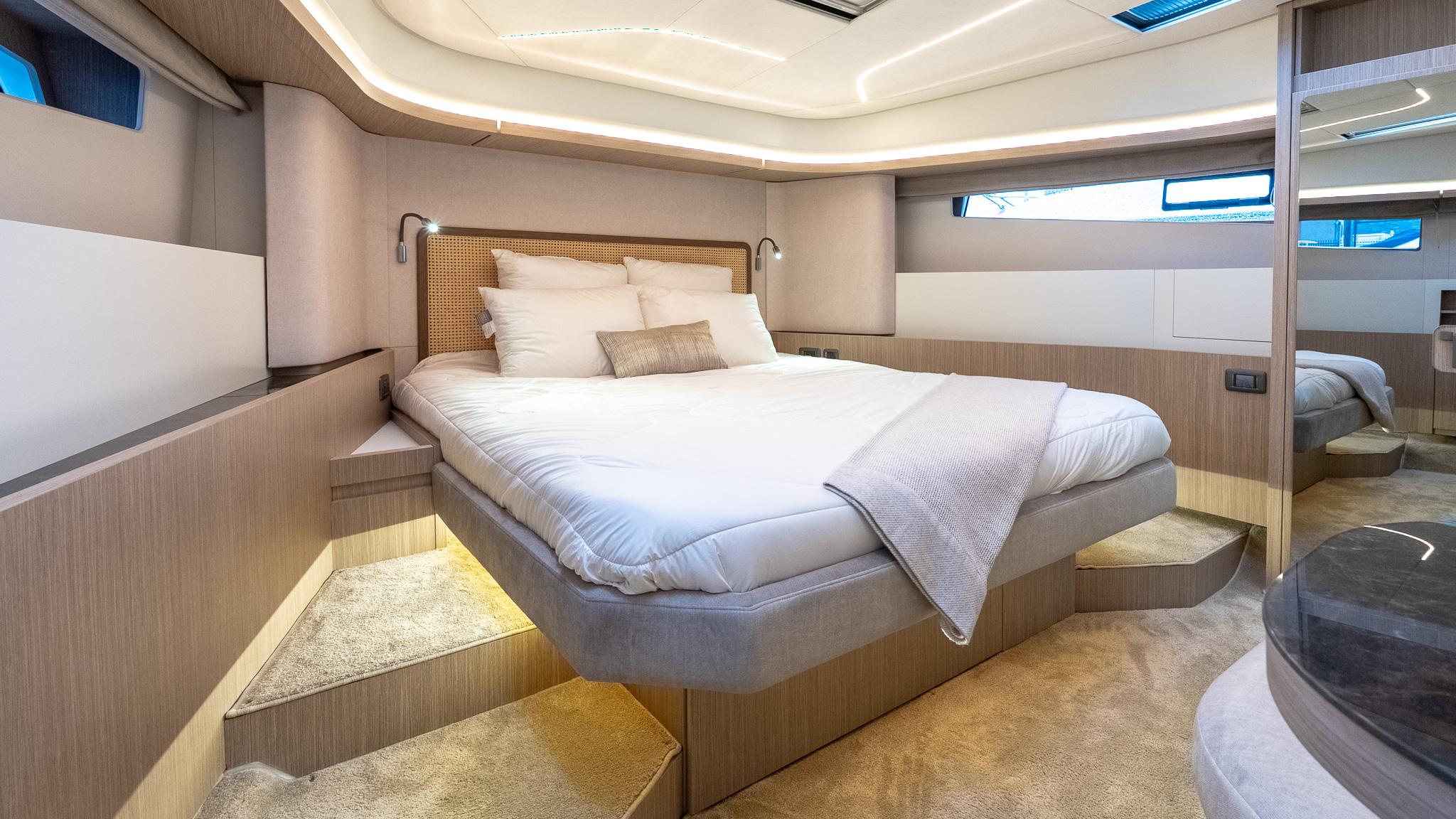 Inspired by the movement of water, the elegant, fluid exterior lines of the hull of the F4.9 marry perfectly with the polished surfaces of living spaces, reflecting an abundance of natural light. Curves have been meticulously studied to confer softness, refinement, and power to the whole. The exterior and interior furnishings have been reinvented to offer exceptional comfort for all on board. Particular attention has been paid to the selection of new materials, such as natural stone, sculpted woodwork, and wicker. Designed by Garroni Design, the F4.9 heralds the design of future models of the F-Line, featuring even greater comfort and an exceptional level of finish.