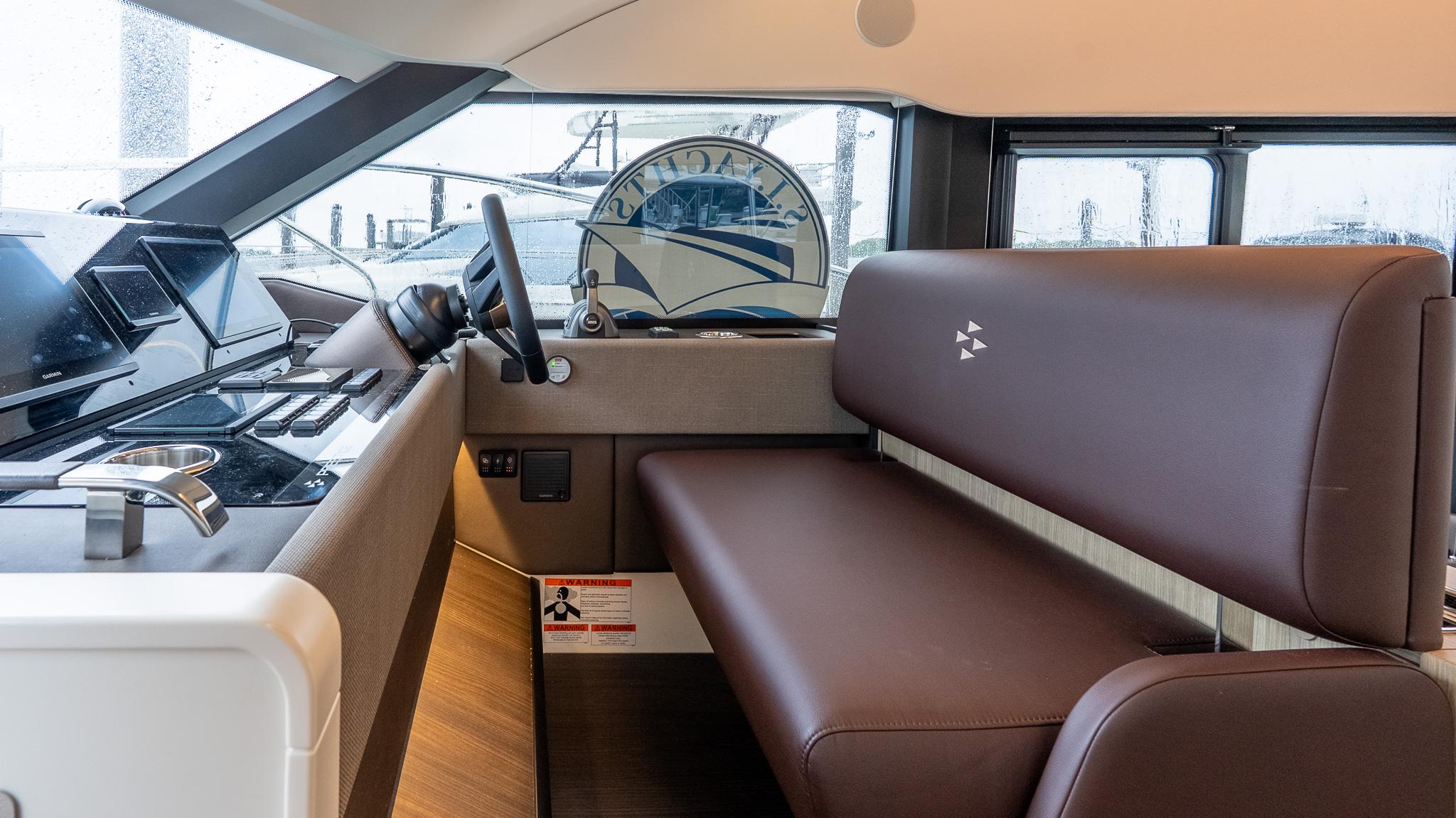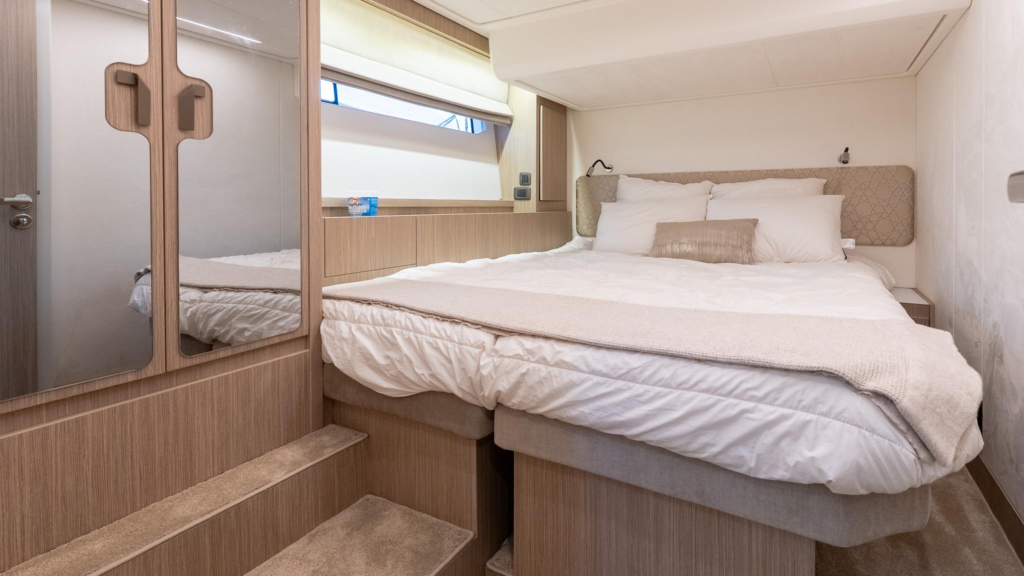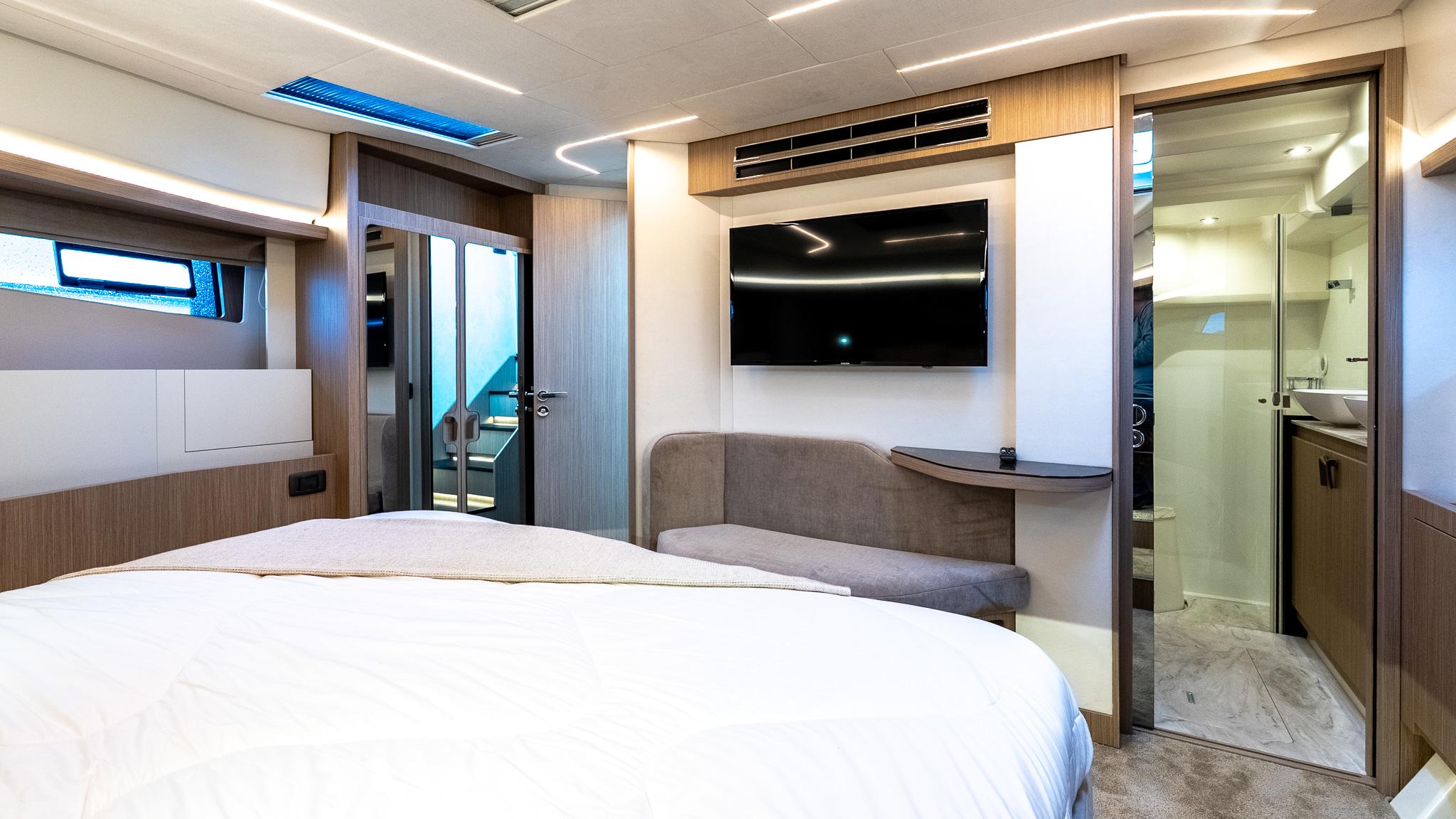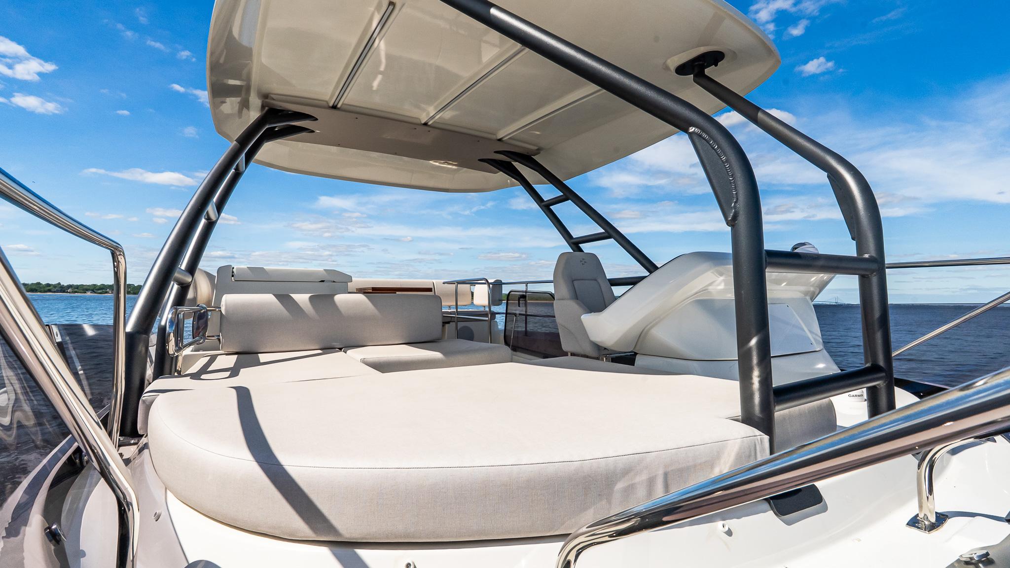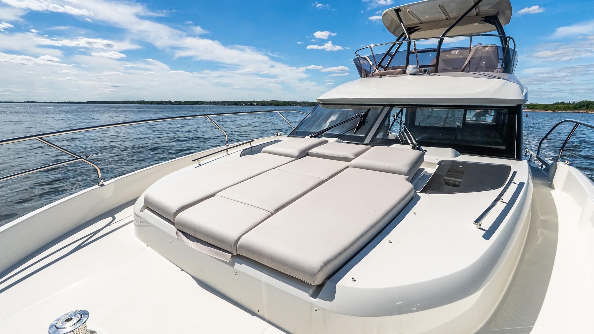 Inspired by the movement of water, the elegant, fluid exterior lines of the hull of the F4.9 marry perfectly with the polished surfaces of living spaces, reflecting an abundance of natural light. Curves have been meticulously studied to confer softness, refinement, and power to the whole. The exterior and interior furnishings have been reinvented to offer exceptional comfort for all on board. Particular attention has been paid to the selection of new materials, such as natural stone, sculpted woodwork, and wicker. Designed by Garroni Design, the F4.9 heralds the design of future models of the F-Line, featuring even greater comfort and an exceptional level of finish.
