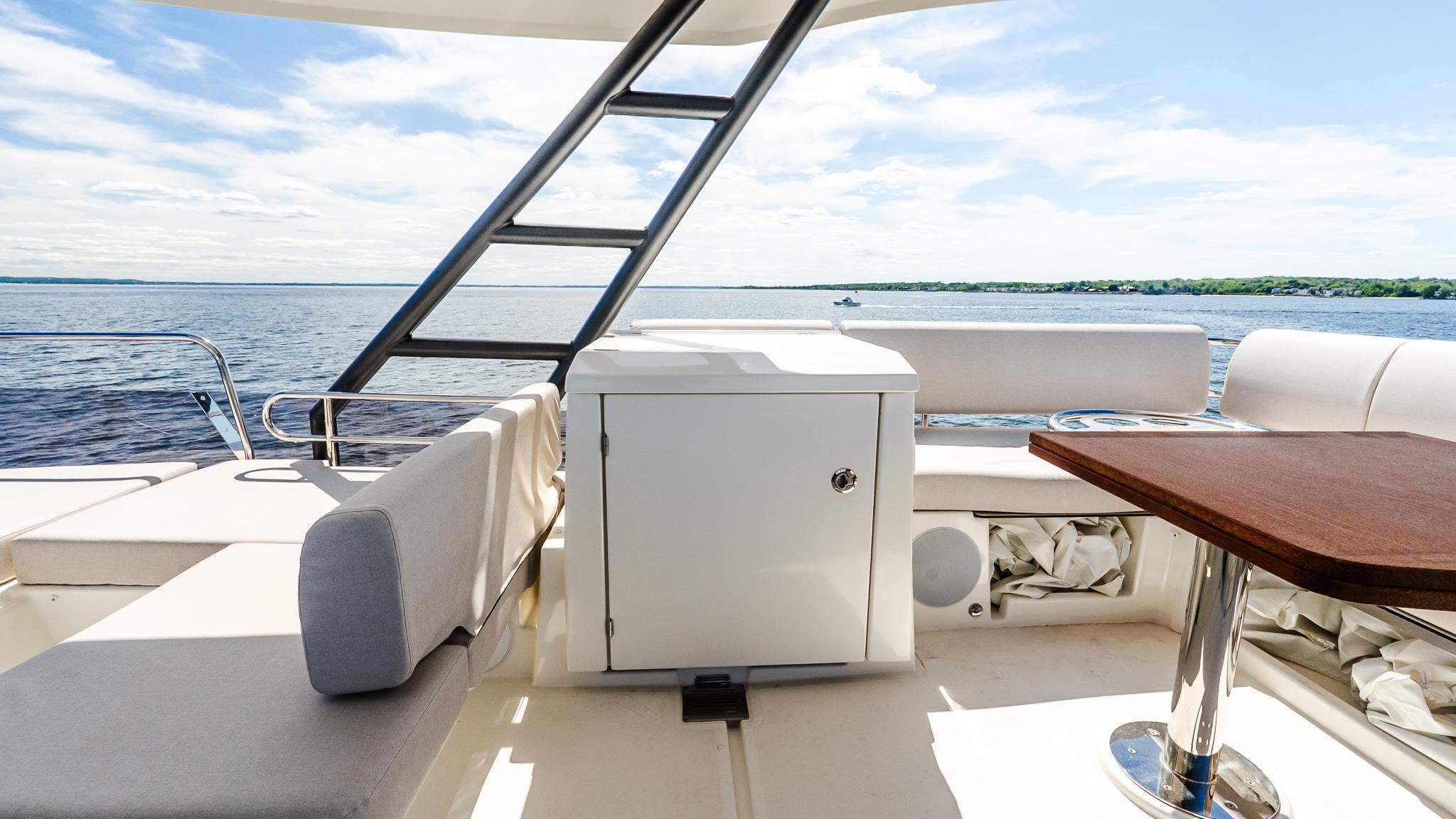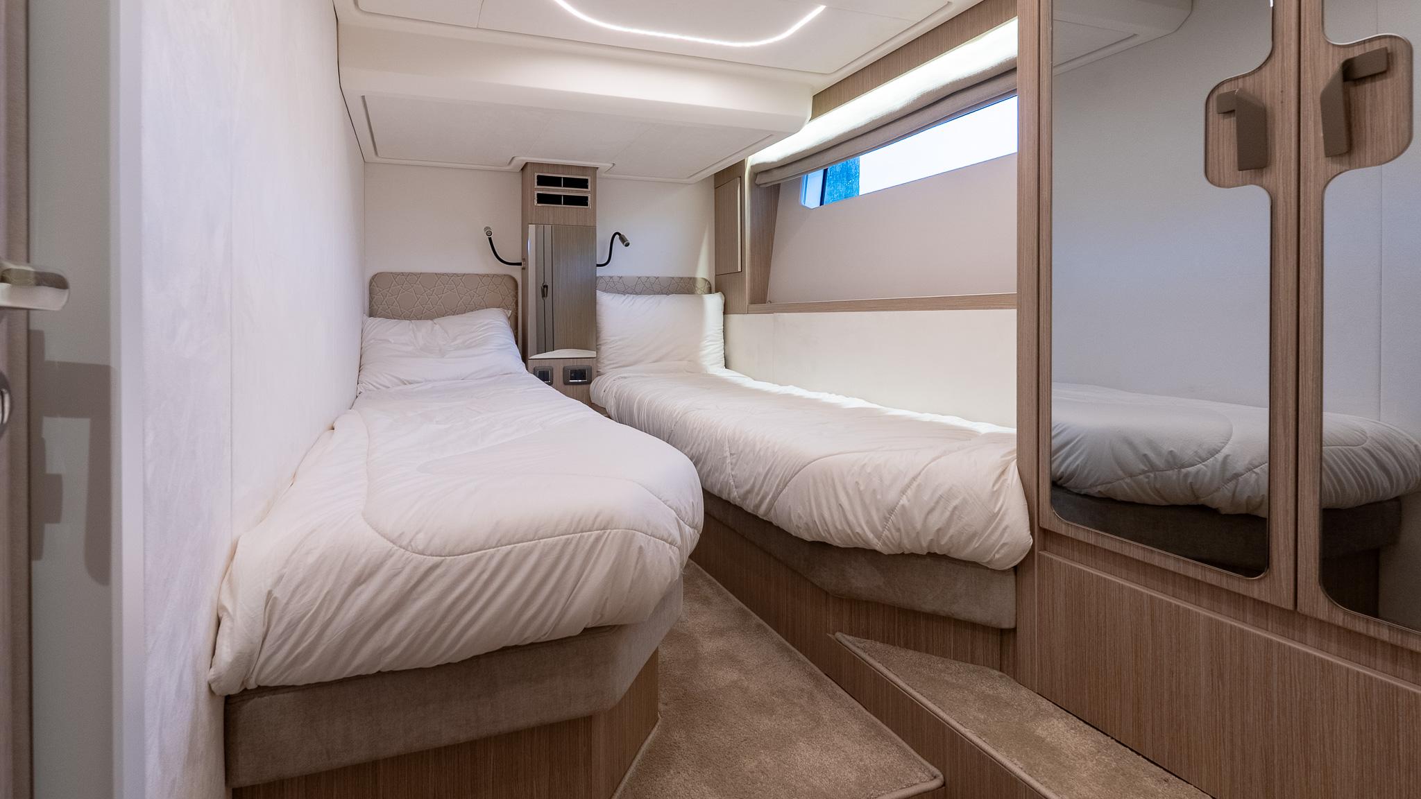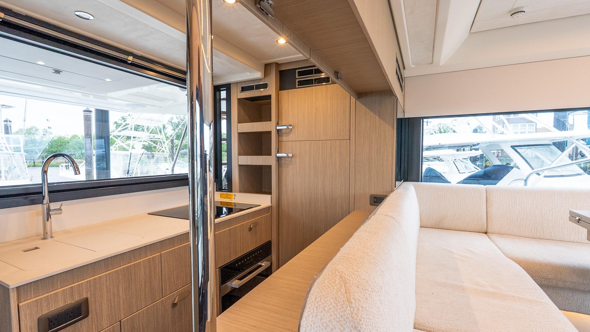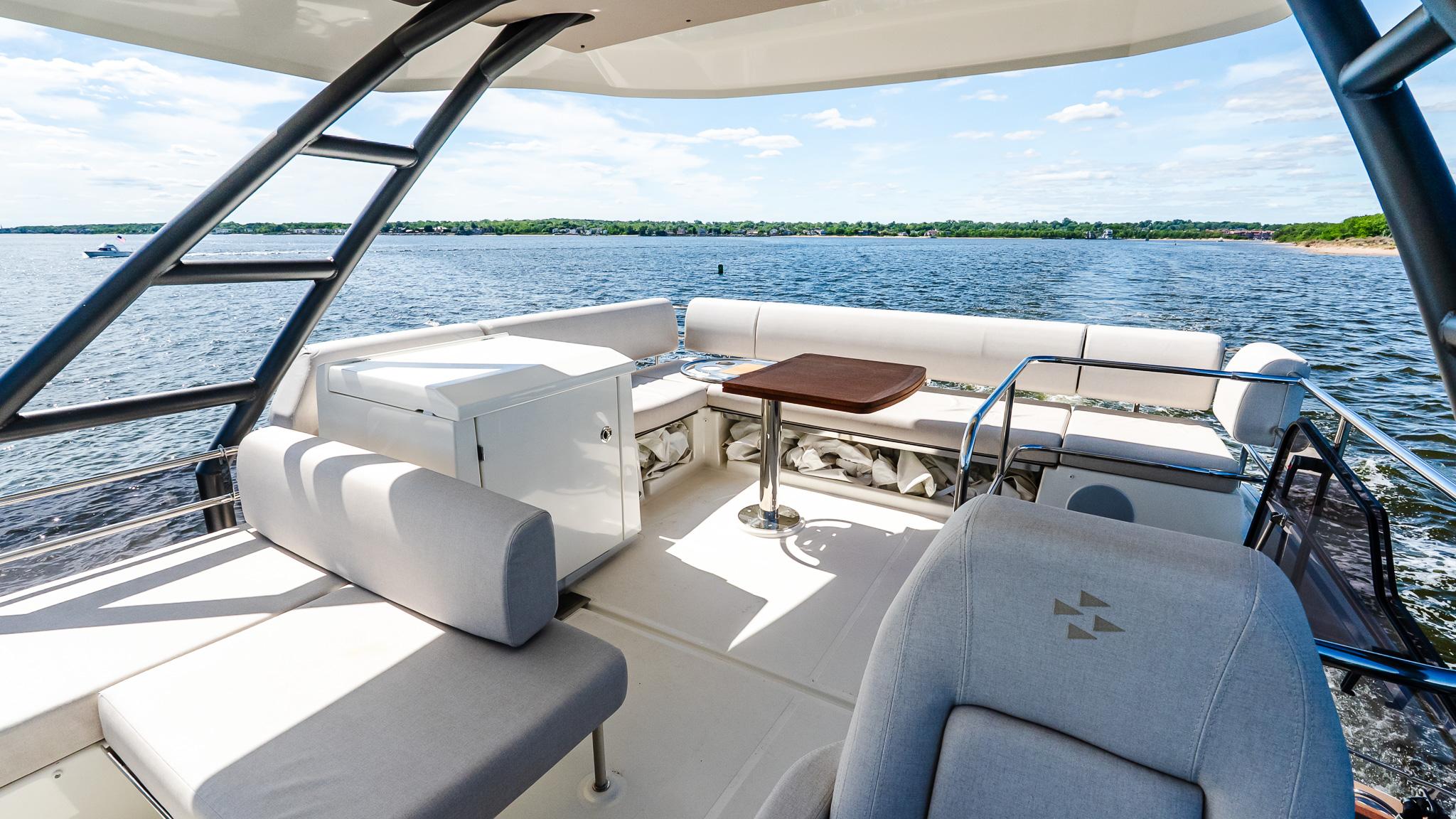 Inspired by the movement of water, the elegant, fluid exterior lines of the hull of the F4.9 marry perfectly with the polished surfaces of living spaces, reflecting an abundance of natural light. Curves have been meticulously studied to confer softness, refinement, and power to the whole. The exterior and interior furnishings have been reinvented to offer exceptional comfort for all on board. Particular attention has been paid to the selection of new materials, such as natural stone, sculpted woodwork, and wicker. Designed by Garroni Design, the F4.9 heralds the design of future models of the F-Line, featuring even greater comfort and an exceptional level of finish.