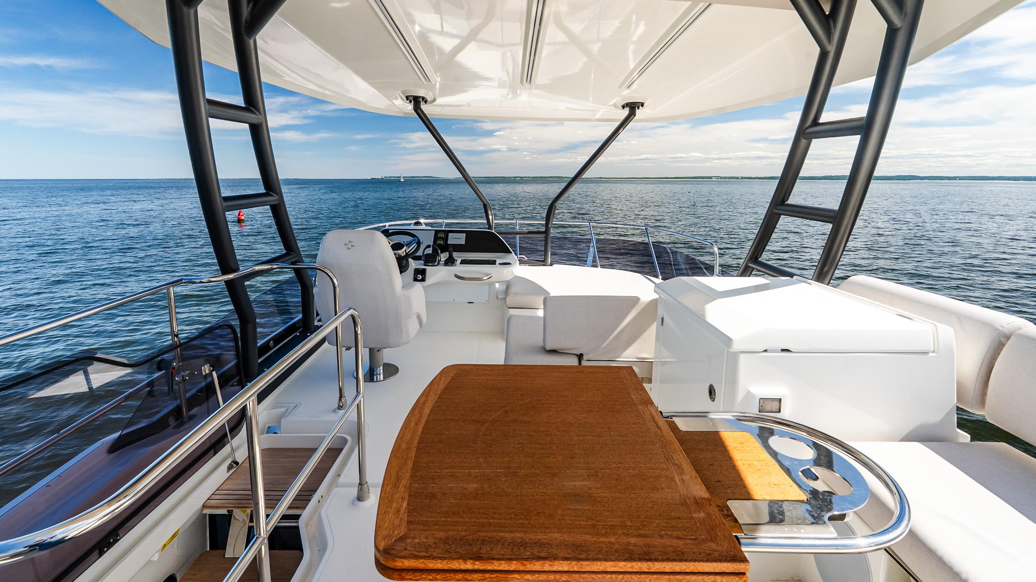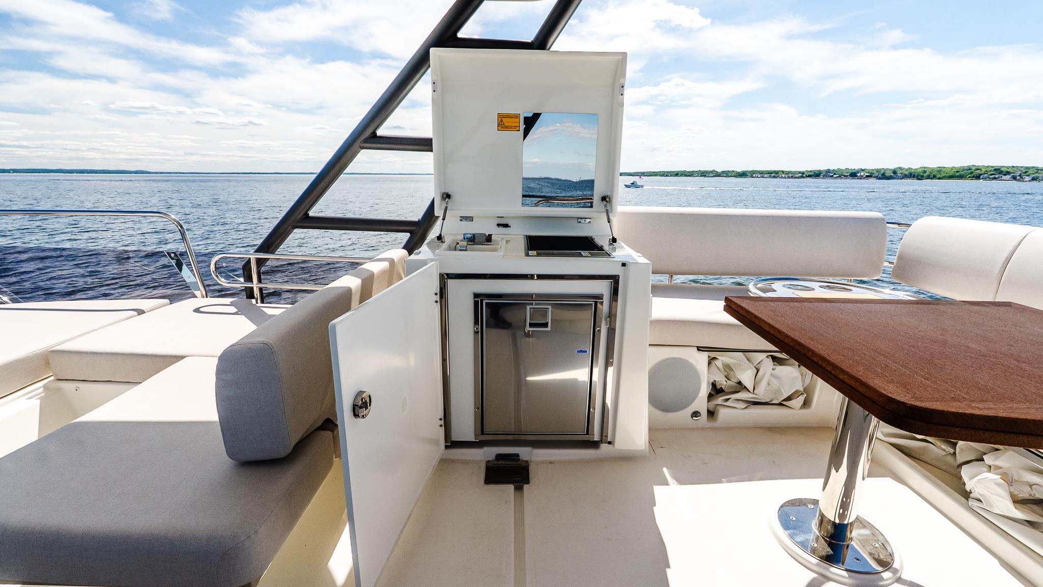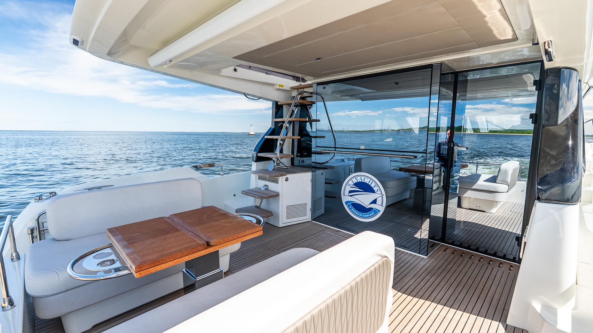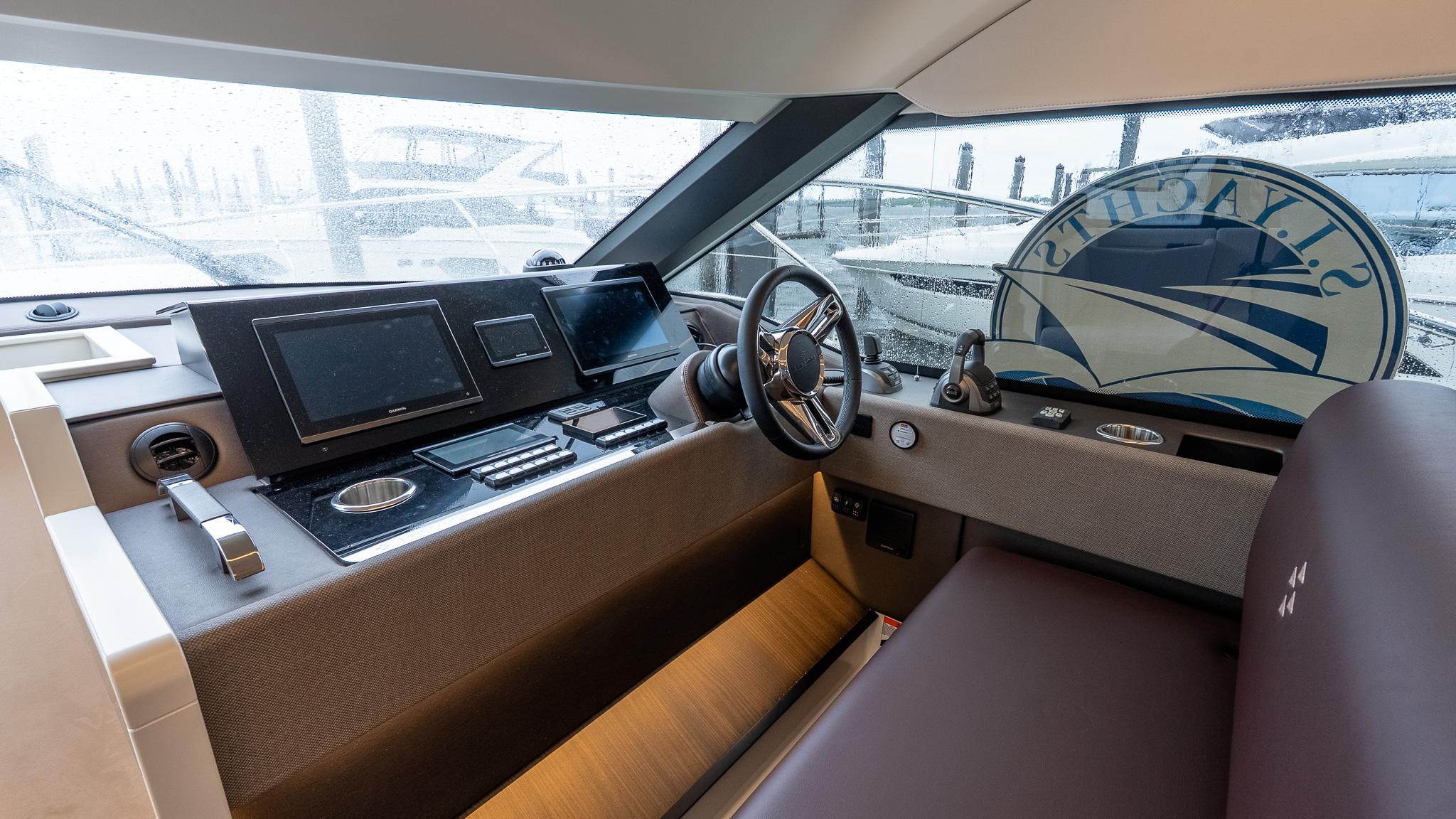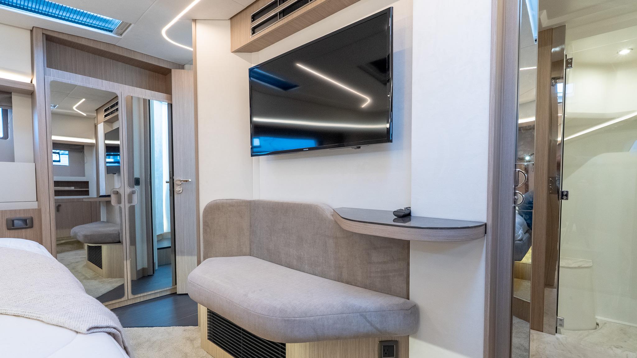 Inspired by the movement of water, the elegant, fluid exterior lines of the hull of the F4.9 marry perfectly with the polished surfaces of living spaces, reflecting an abundance of natural light. Curves have been meticulously studied to confer softness, refinement, and power to the whole. The exterior and interior furnishings have been reinvented to offer exceptional comfort for all on board. Particular attention has been paid to the selection of new materials, such as natural stone, sculpted woodwork, and wicker. Designed by Garroni Design, the F4.9 heralds the design of future models of the F-Line, featuring even greater comfort and an exceptional level of finish.