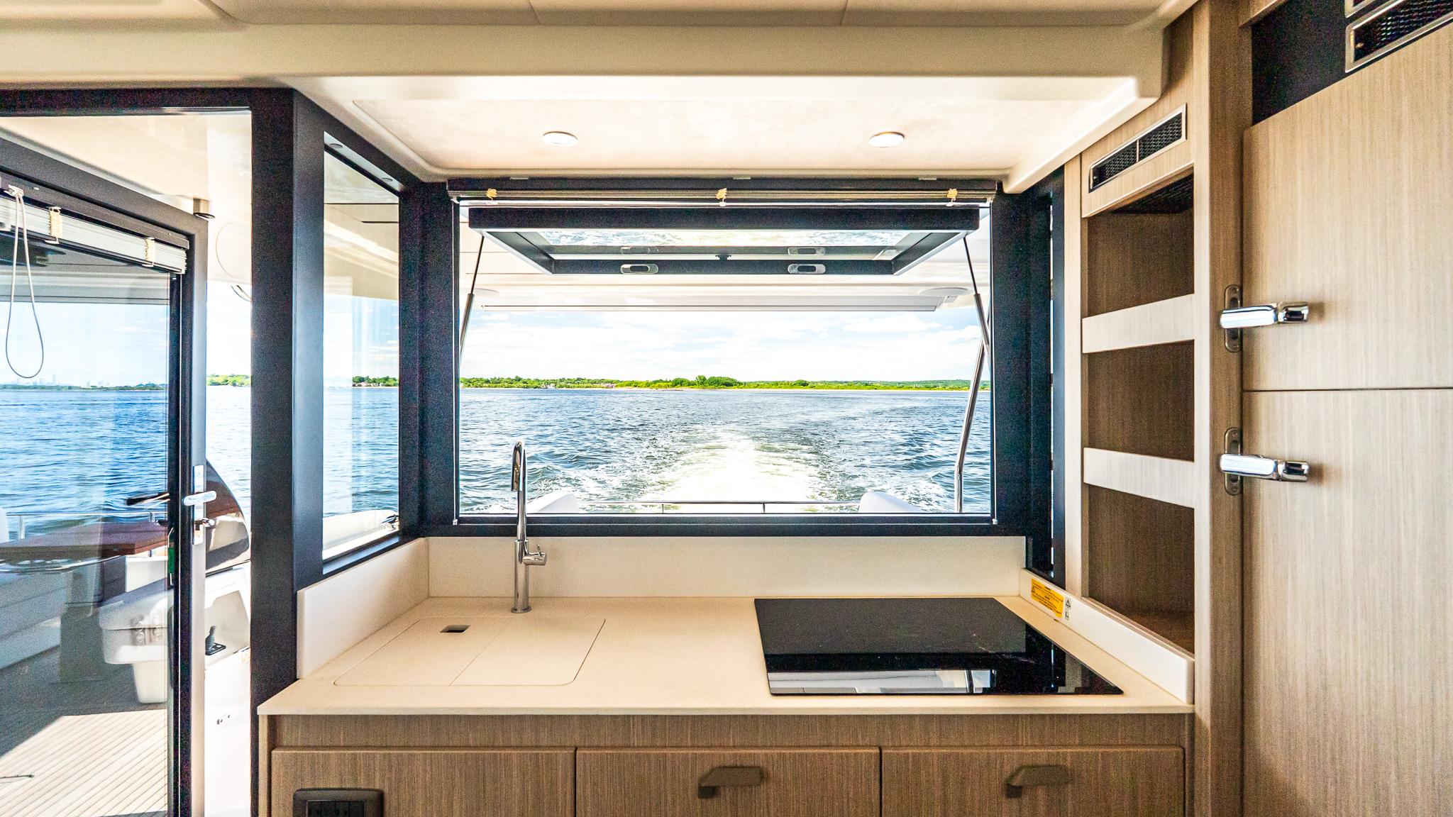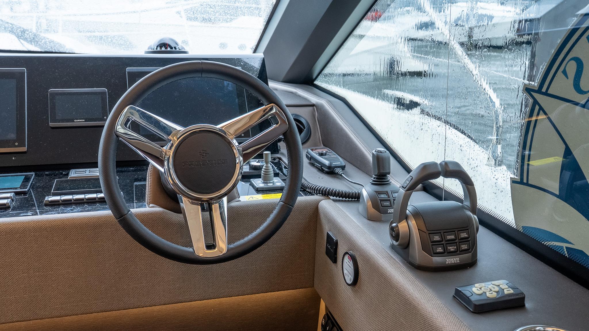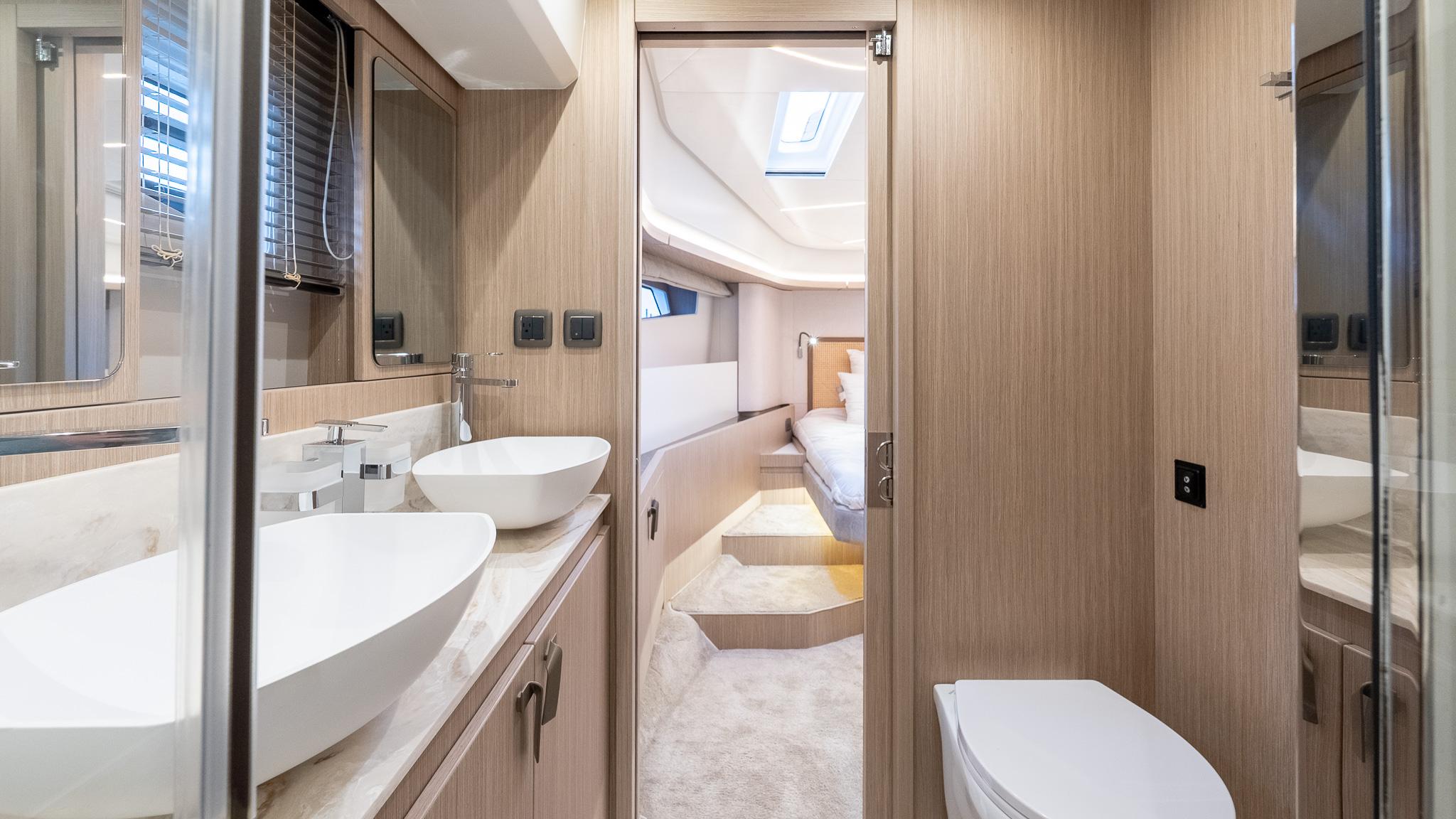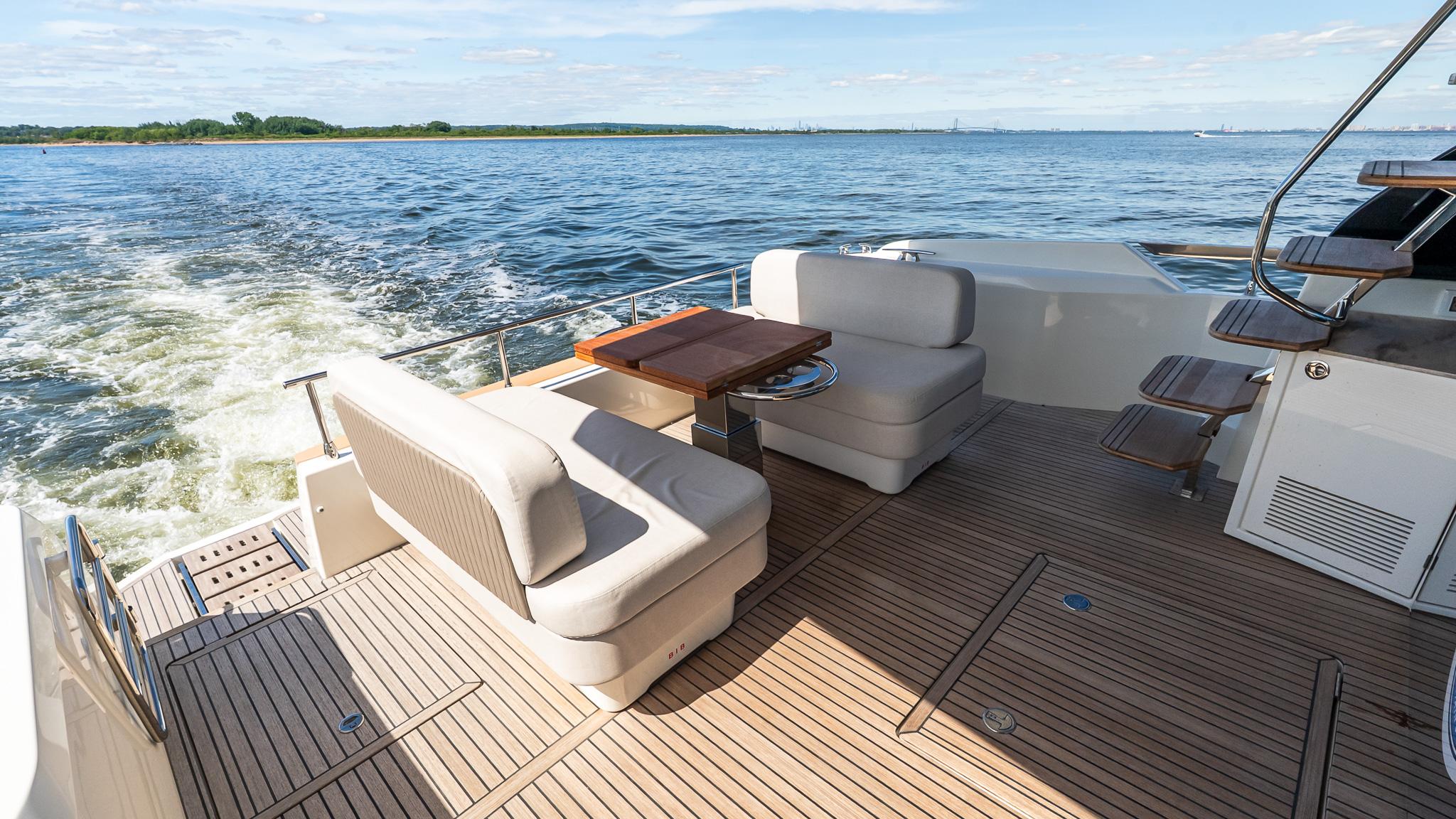 Inspired by the movement of water, the elegant, fluid exterior lines of the hull of the F4.9 marry perfectly with the polished surfaces of living spaces, reflecting an abundance of natural light. Curves have been meticulously studied to confer softness, refinement, and power to the whole. The exterior and interior furnishings have been reinvented to offer exceptional comfort for all on board. Particular attention has been paid to the selection of new materials, such as natural stone, sculpted woodwork, and wicker. Designed by Garroni Design, the F4.9 heralds the design of future models of the F-Line, featuring even greater comfort and an exceptional level of finish.