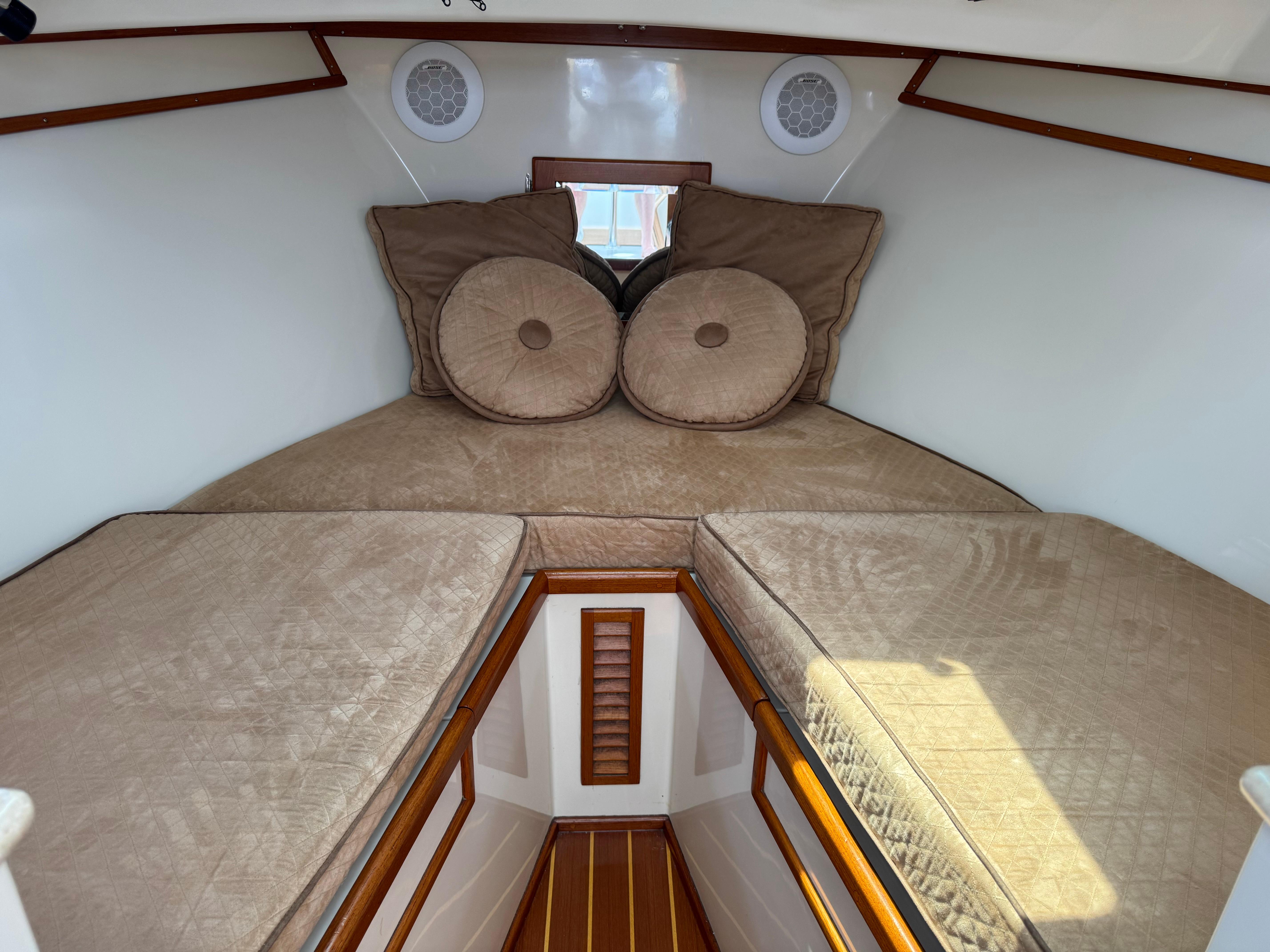 The forward cabin offers a comfortable V-berth for two, accented by a forward bulkhead shelf, polished stainless steel handrails, and warm teak trim throughout. A Bomar overhead hatch and four stainless steel opening ports provide excellent ventilation and natural light. The enclosed marine head with holding tank is smartly positioned to port under the V-berth cushion for efficient use of space.