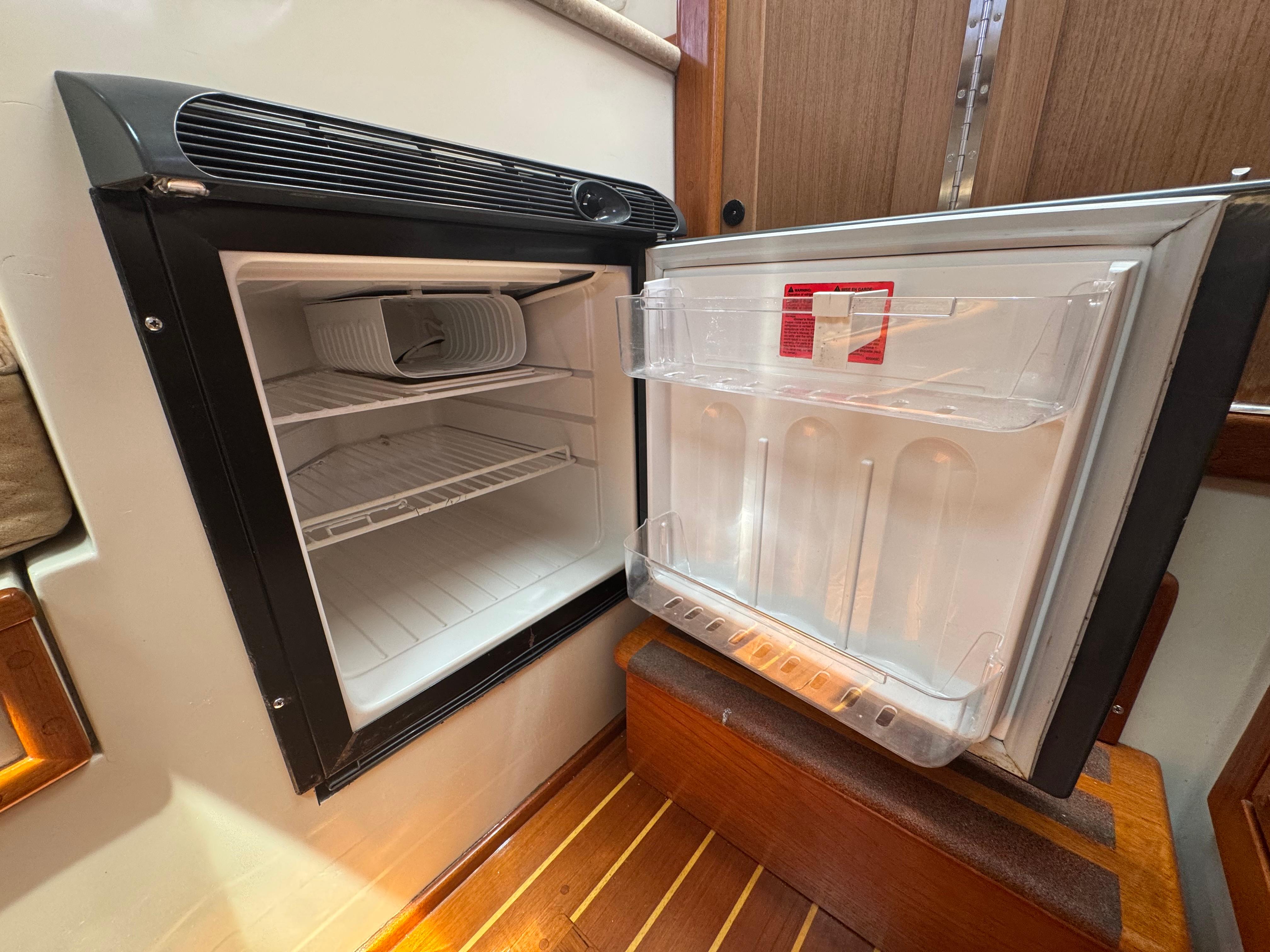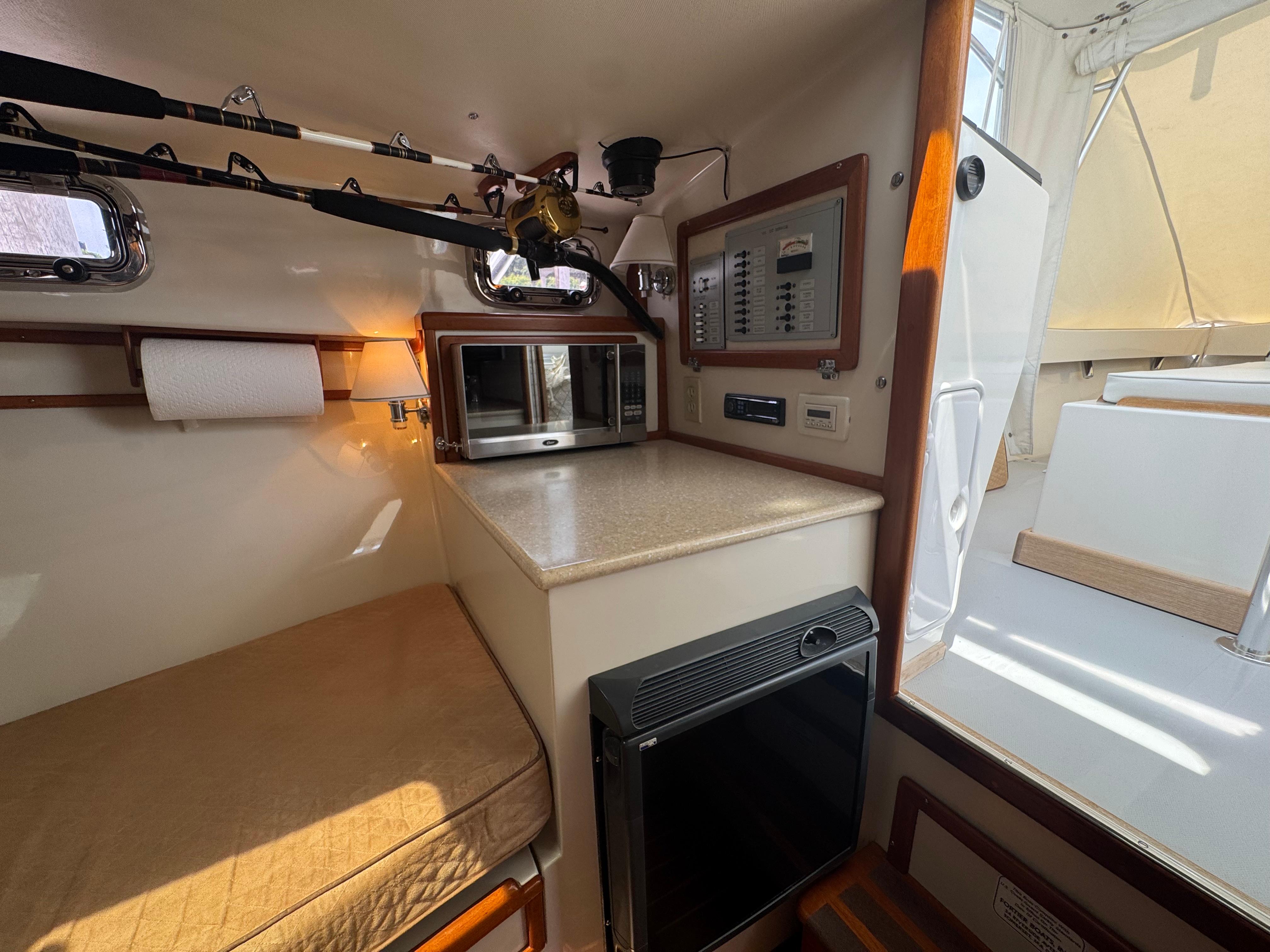 Compact yet capable, the galley includes a stainless steel sink with hot and cold pressure water, Corian countertops, a Norcold refrigerator and a Oster microwave, offering all the essentials for preparing meals onboard.