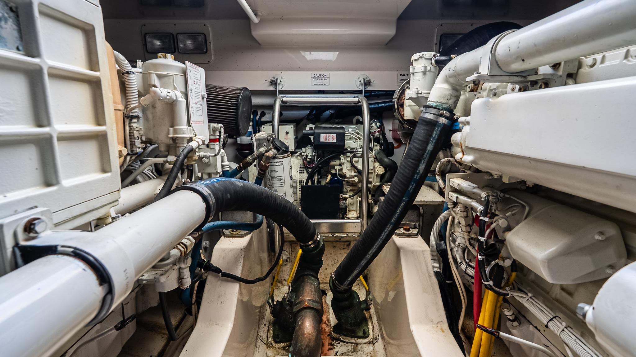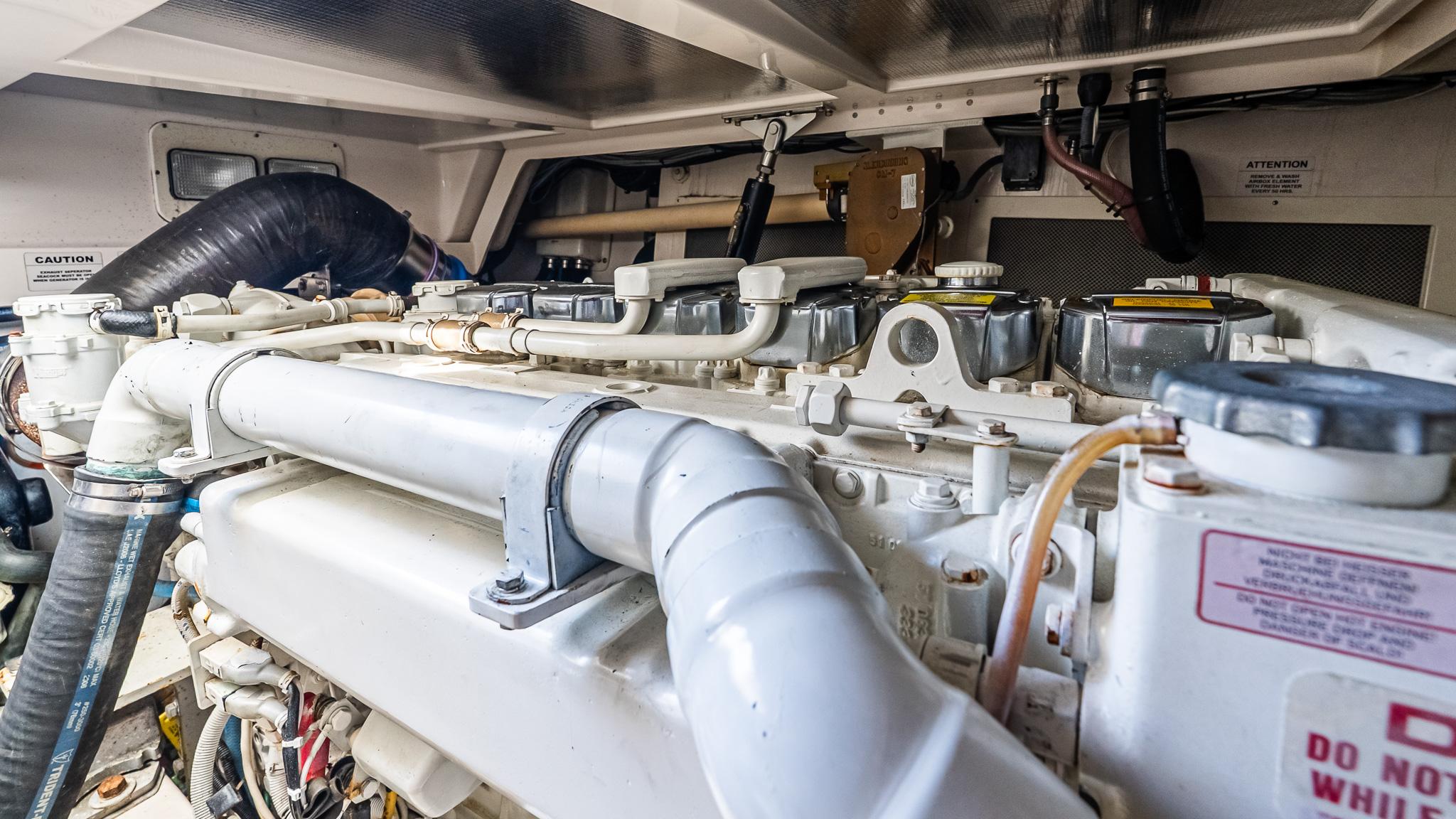 The entire helm deck electrically and hydraulically raises activated by a switch from the cockpit making the engine room easy to access and maintain. The bilges are finished in bright white gelcoat with ample space for installation of additional equipment. The systems are meticulously organized, grouping major components, for ease of accessibility and maintenance. Fuel lines are fire-retardant, aircraft-grade braided stainless steel and all wiring is tin copper to resist corrosion.