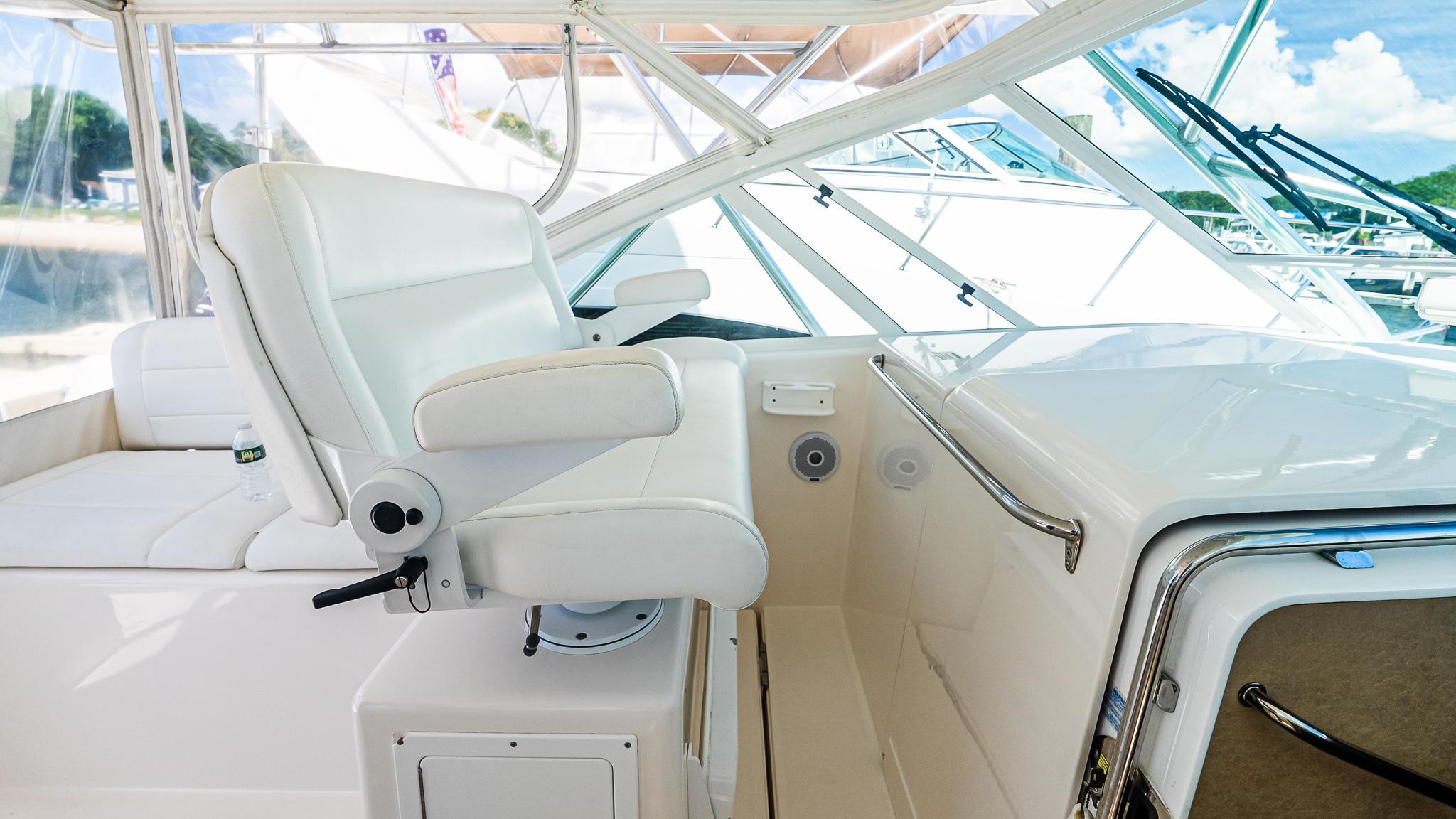 - Stidd helm passenger seat with white upholstery, canvas cover, and foot bolster