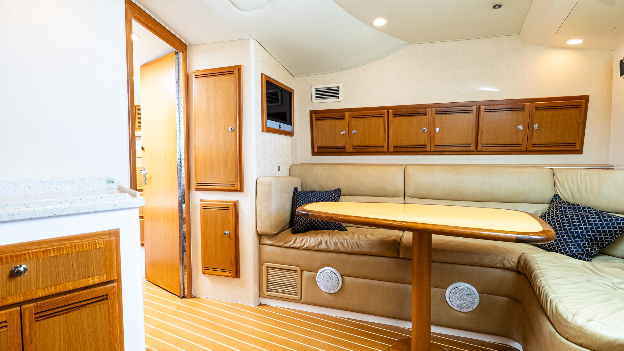 MAIN CABINBelow deck the salon and galley provide hand-selected teak wood with its ultra high-density grain and natural oils, which is milled in-house, varnished and then buffed to a satin finish. The optional teak and holly floor provide for a luxurious finished detail. The L-shaped lounge converts to an upper/lower berth arrangement, for additional sleeping accommodations.