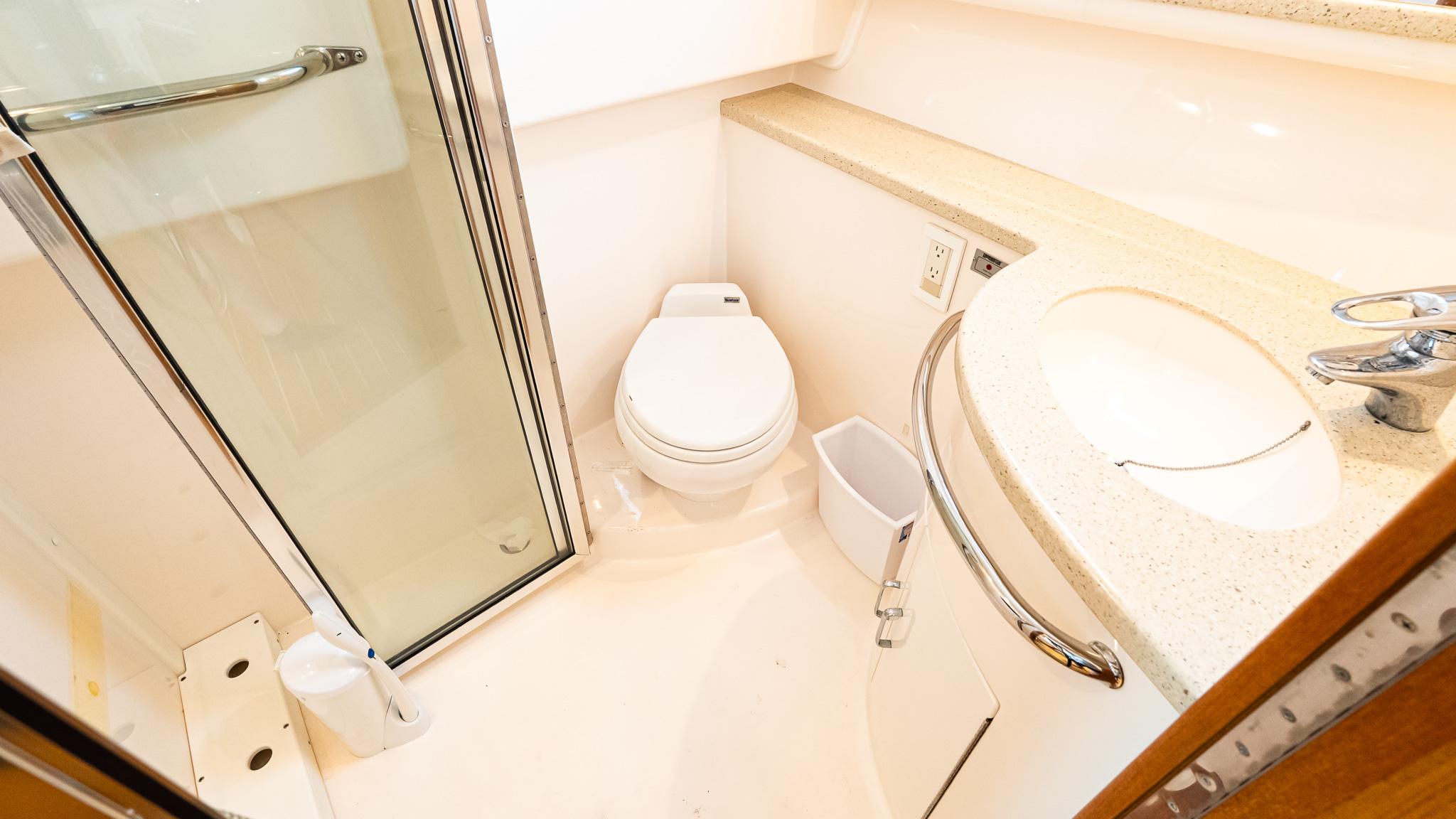 STATEROOMThe forward stateroom features a Queen pedestal V-berth to accommodate two adults, with abundant overhead storage lockers, two hanging lockers and drawer and shelf storage below the bed.