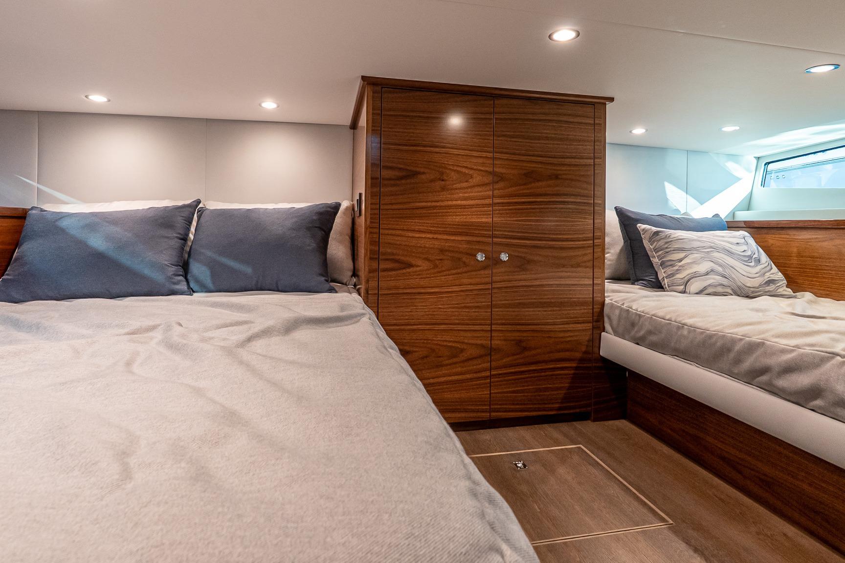Side-by-side aft stateroom berths with hanging locker and end tables