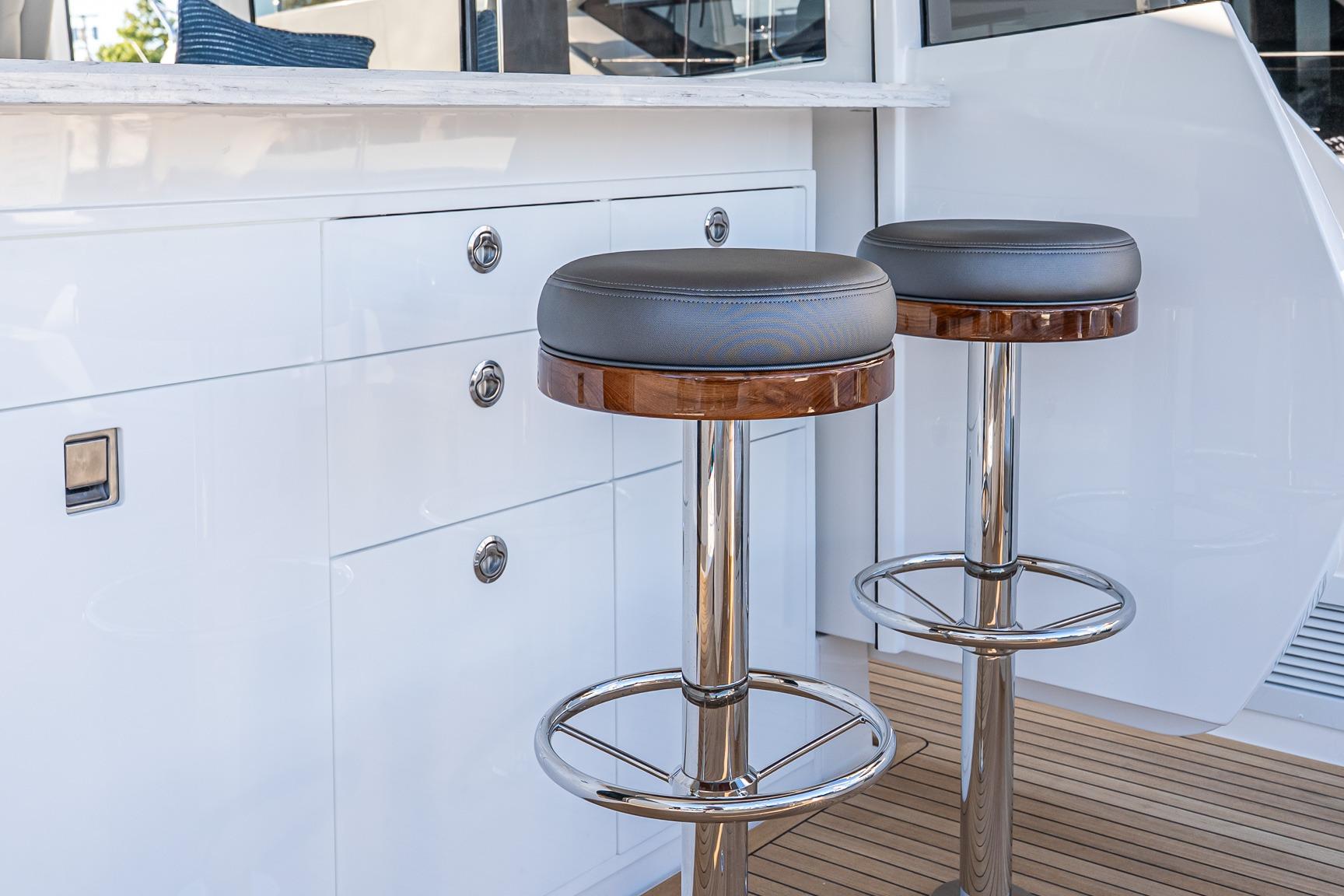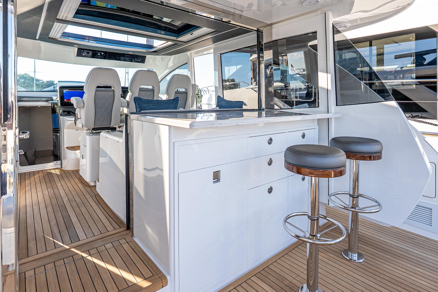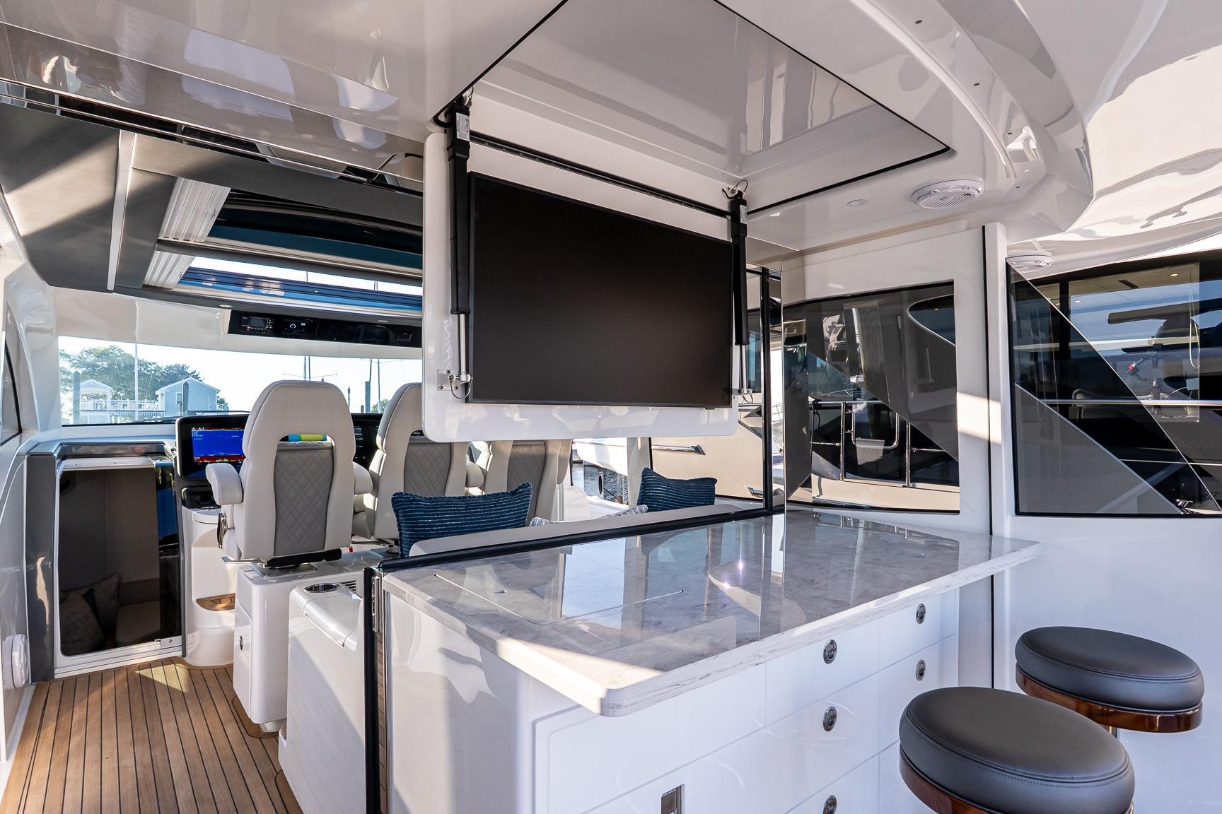 Stars & Stripes hull color with custom summer kitchen, Garmin electronics package, Seakeeper, Split-bunk second stateroom.
