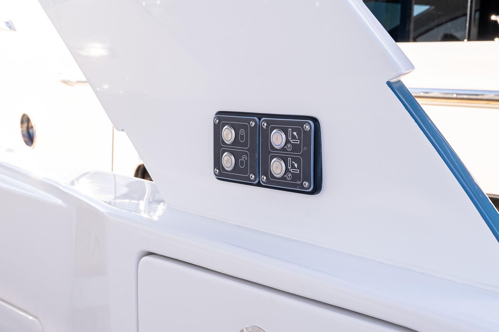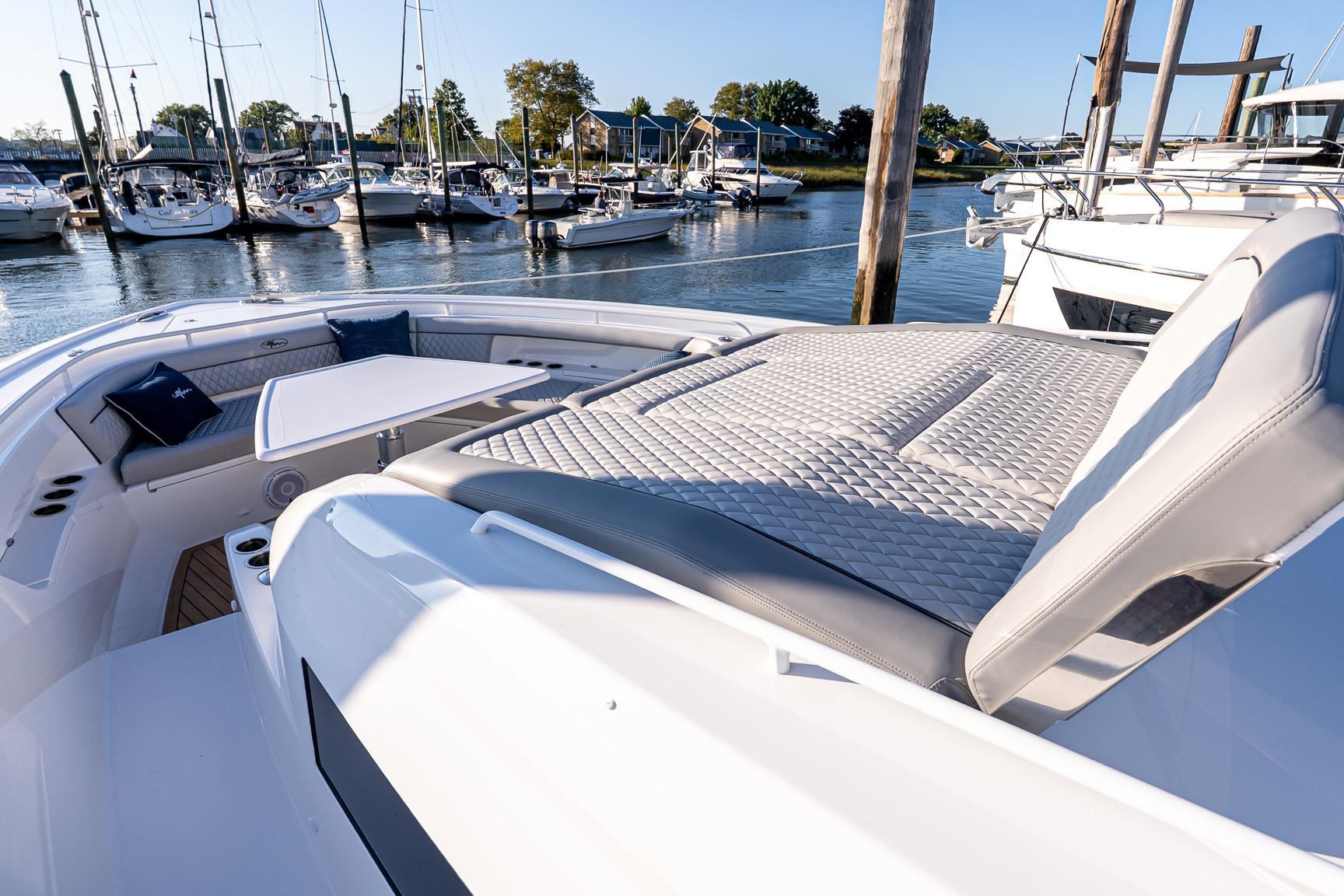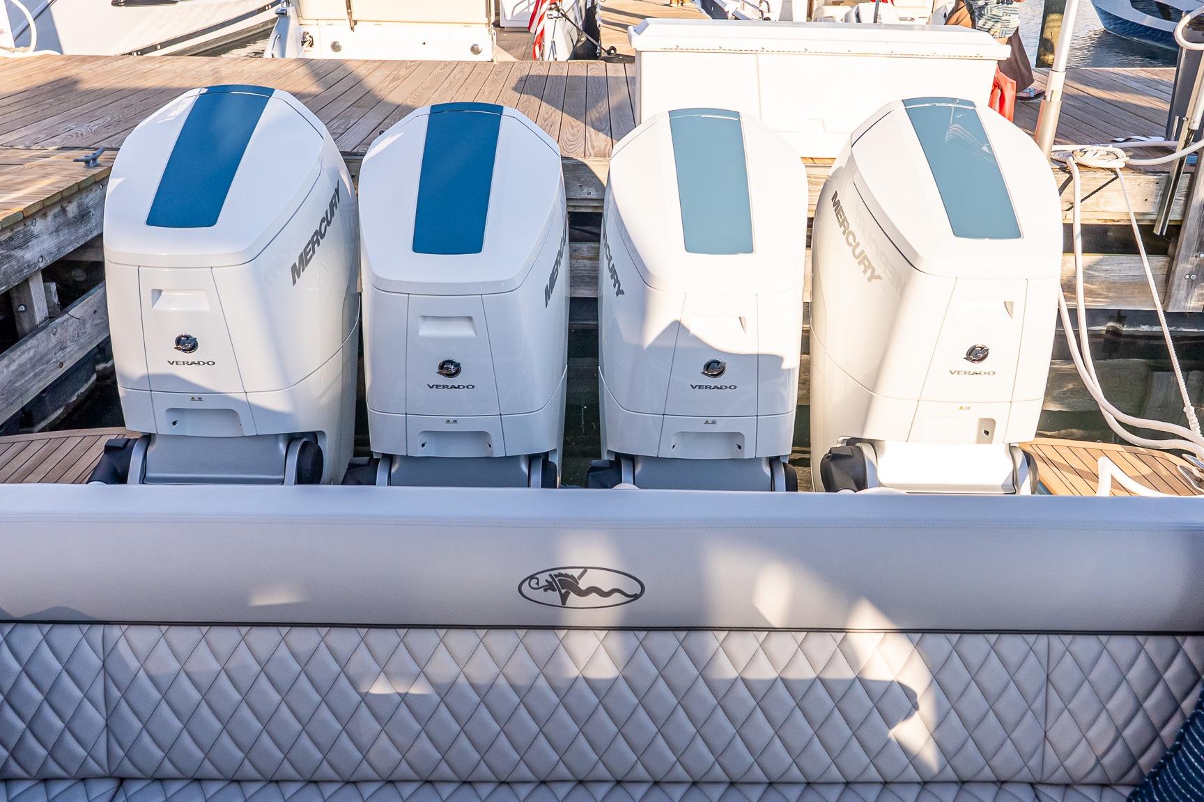 Stars & Stripes hull color with custom summer kitchen, Garmin electronics package, Seakeeper, Split-bunk second stateroom.