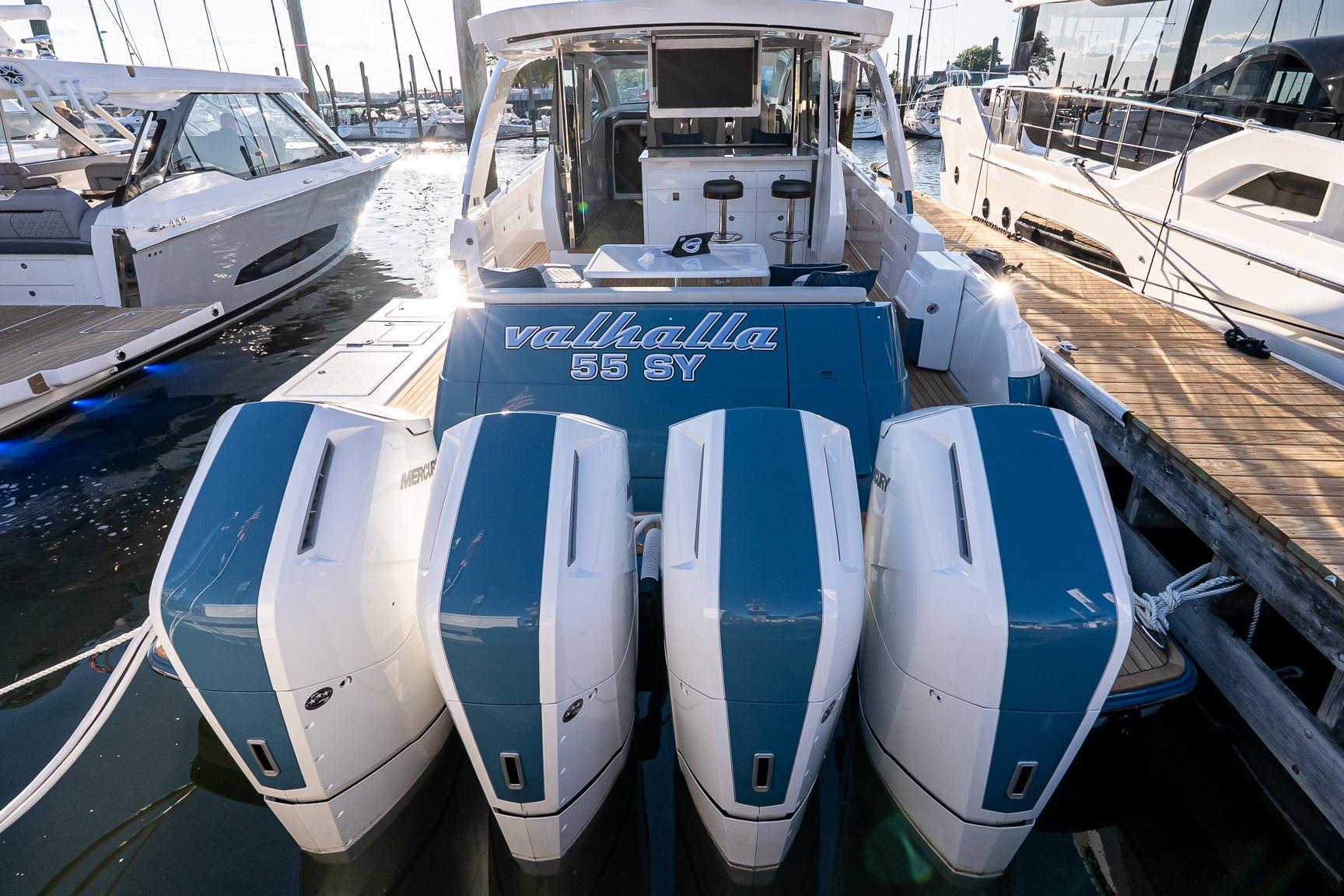 The all-new 2026 Valhalla V-55 Sport Yacht blends the performance DNA of Viking Yachts with luxury cruising comfort. Powered by quad Mercury Verado V12 600s, this model delivers 2,400 horsepower for unmatched speed, stability, and efficiency thanks to the Michael Peters Stepped-V Ventilated Tunnel hull.
