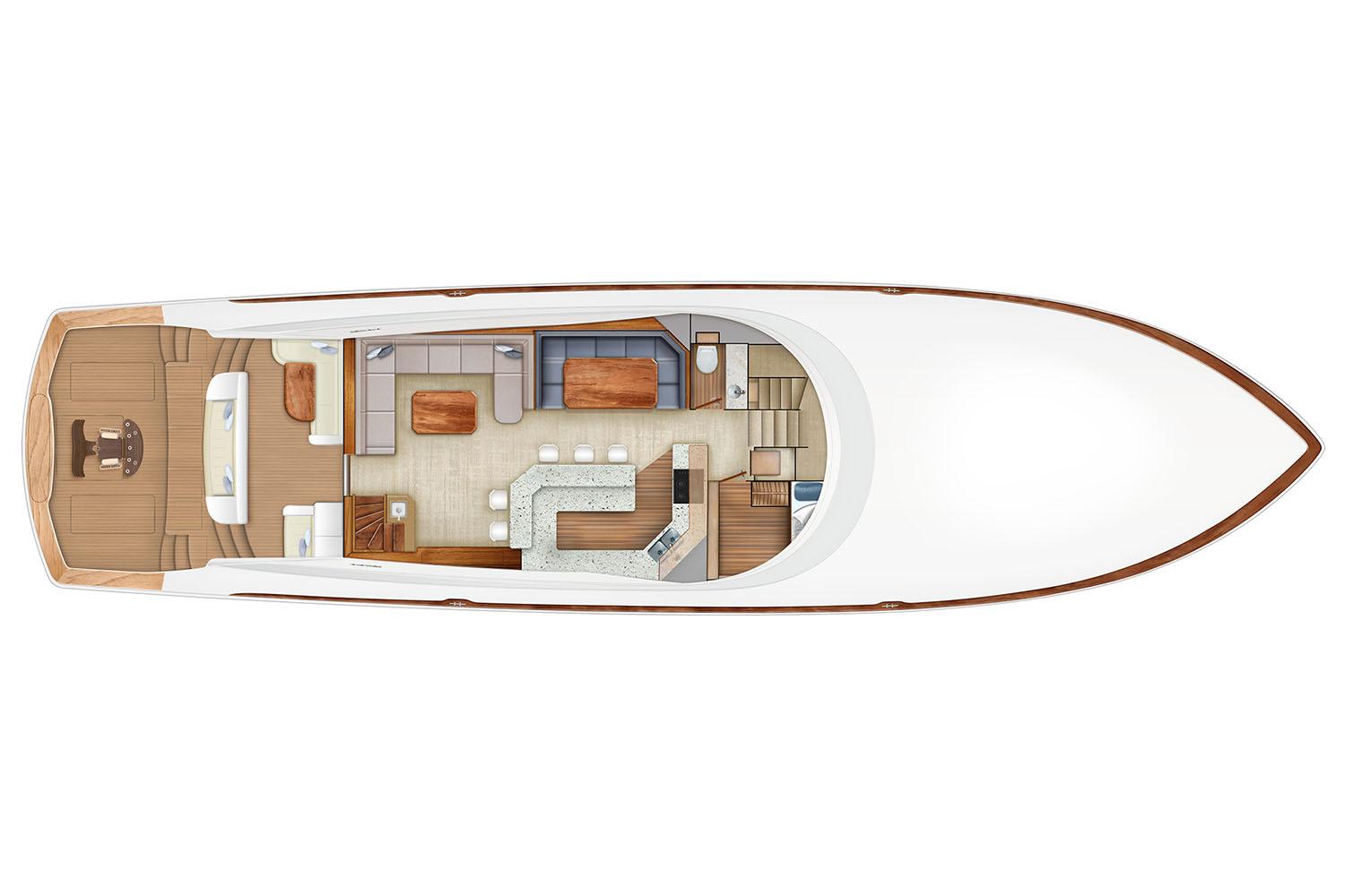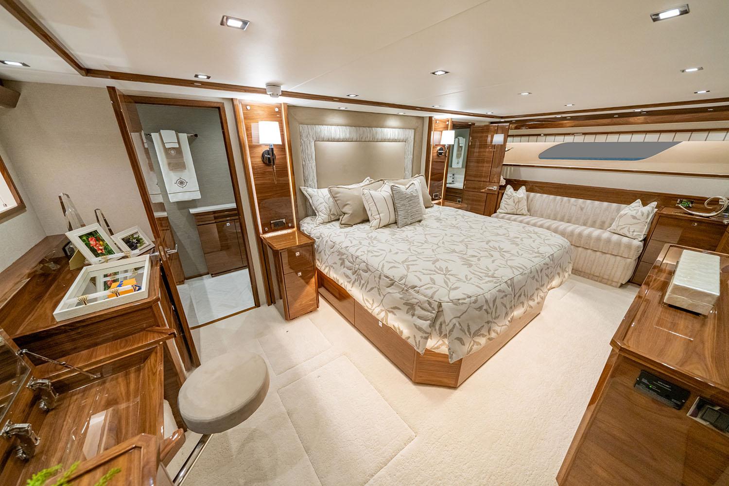 Below deck, the five-stateroom, seven-head layout provides privacy and comfort for every guest: