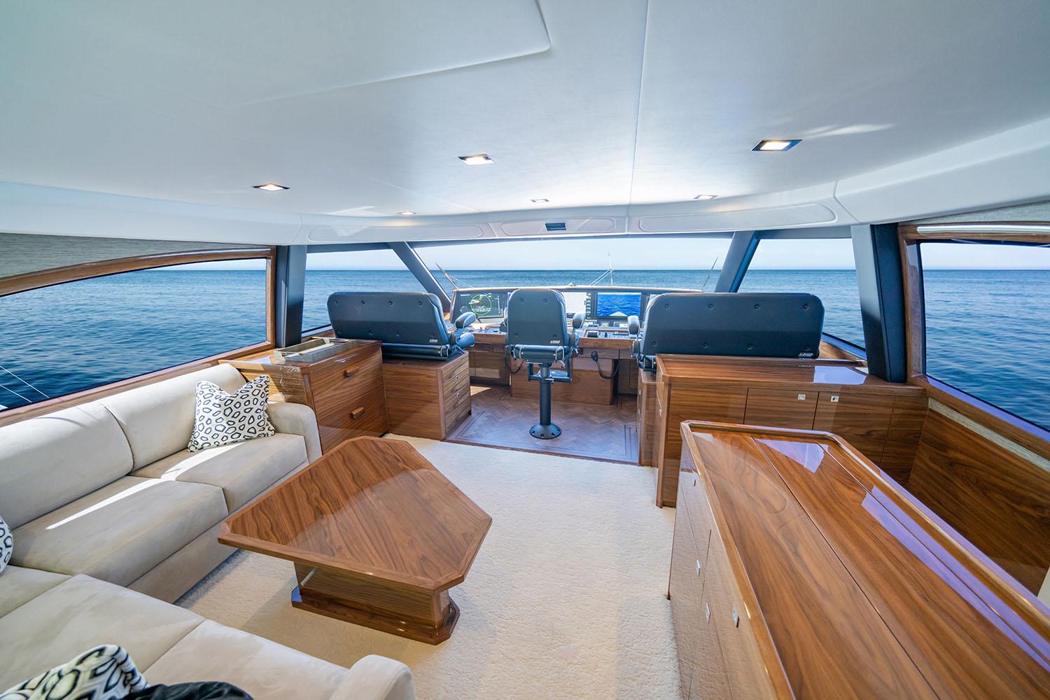 The sleek, low-profile exterior incorporates Viking’s signature hull-side vents, chamfered portlights, and modern deckhouse lines—creating an unmistakable presence at sea.