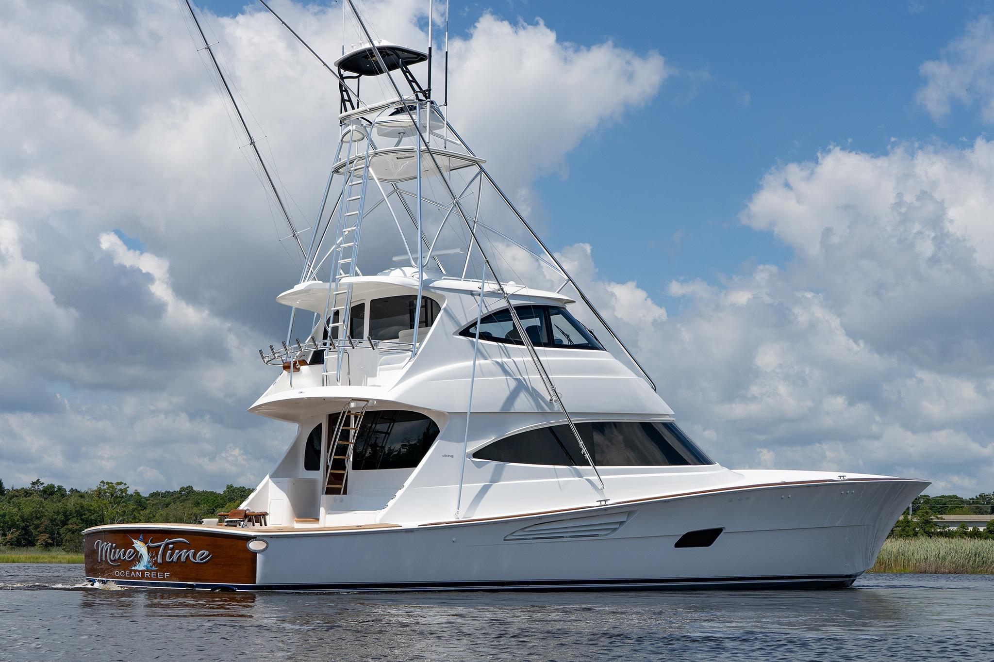 The five-stateroom, six-head layout showcases Viking’s signature horizontal-grain walnut cabinetry and meticulous fit-and-finish. The full-beam owner’s suite includes a king berth, lounge seating, vanity, and spa-inspired ensuite with dual sinks and walk-in shower. Each guest stateroom features a private head and shower, and the crew quarters offer direct engine-room access.