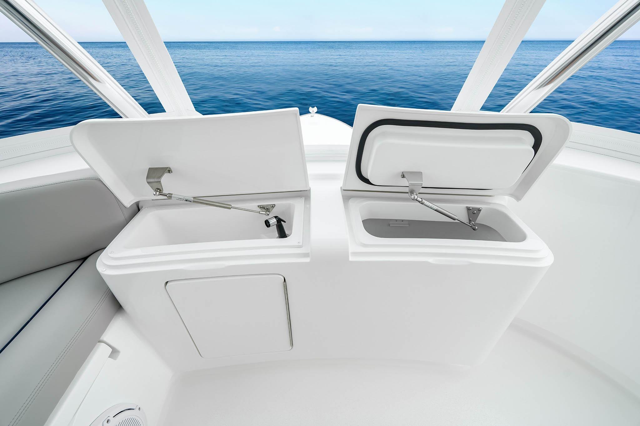 The cockpit, at over 200 sq. ft., is engineered for serious offshore action with mezzanine seating, insulated in-deck fish boxes, transom livewell, freezer, tackle storage, and optional Seakeeper gyro stabilization. Air-conditioned mezzanine seating and shaded overhangs make it equally comfortable for cruising or tournament fishing.