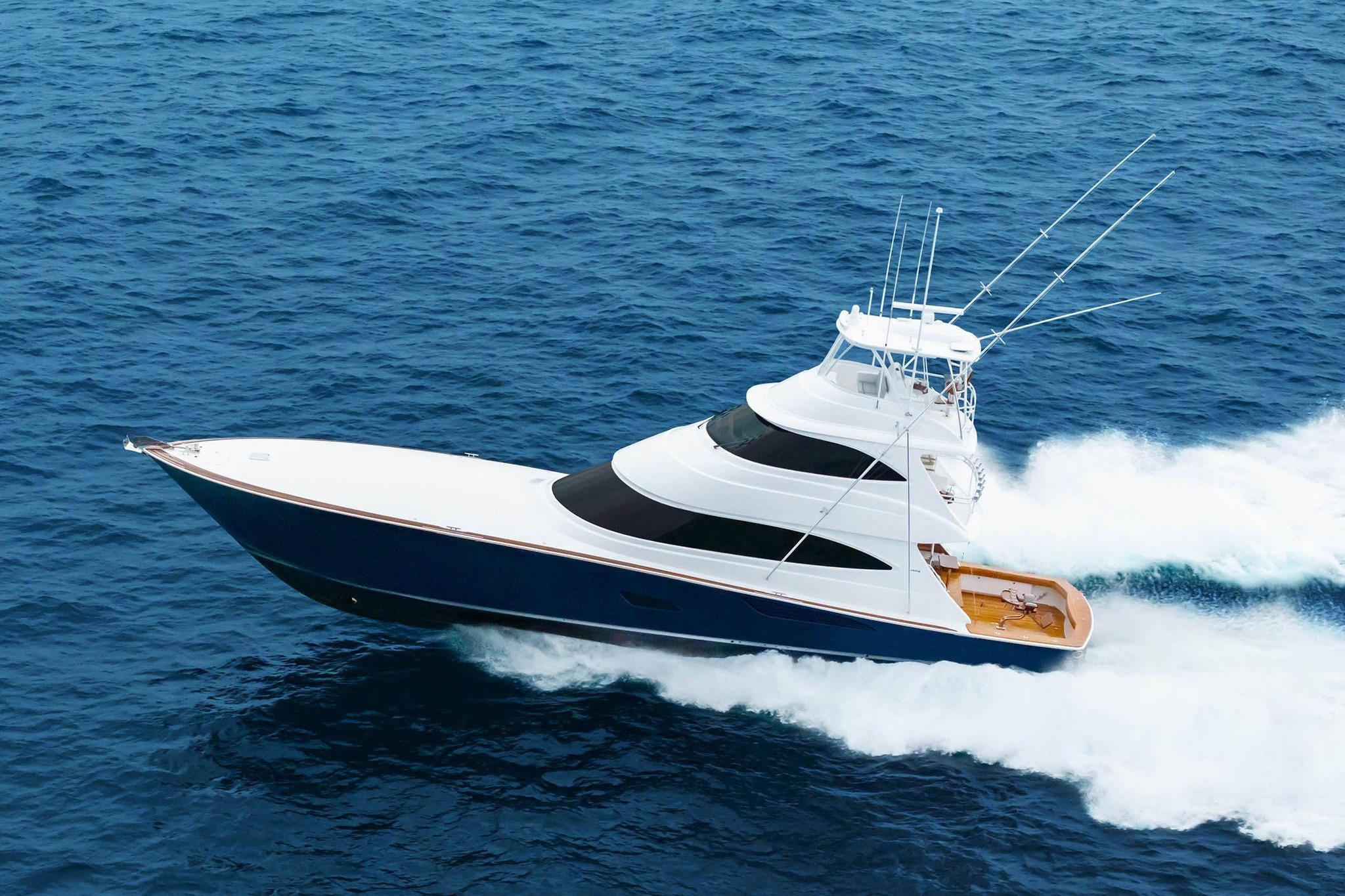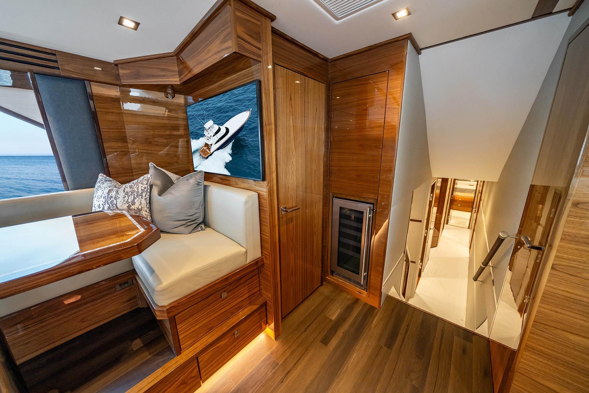 Below deck, the five-stateroom, six-head layout reflects Viking’s reputation for luxury and practicality. The full-beam master suite includes a king berth, lounge area, and en suite with dual sinks and a walk-in shower. The forward VIP features a queen berth and private head, while additional guest cabins provide upper-lower berths, en suites, and storage. Crew accommodations aft include direct engine room access.