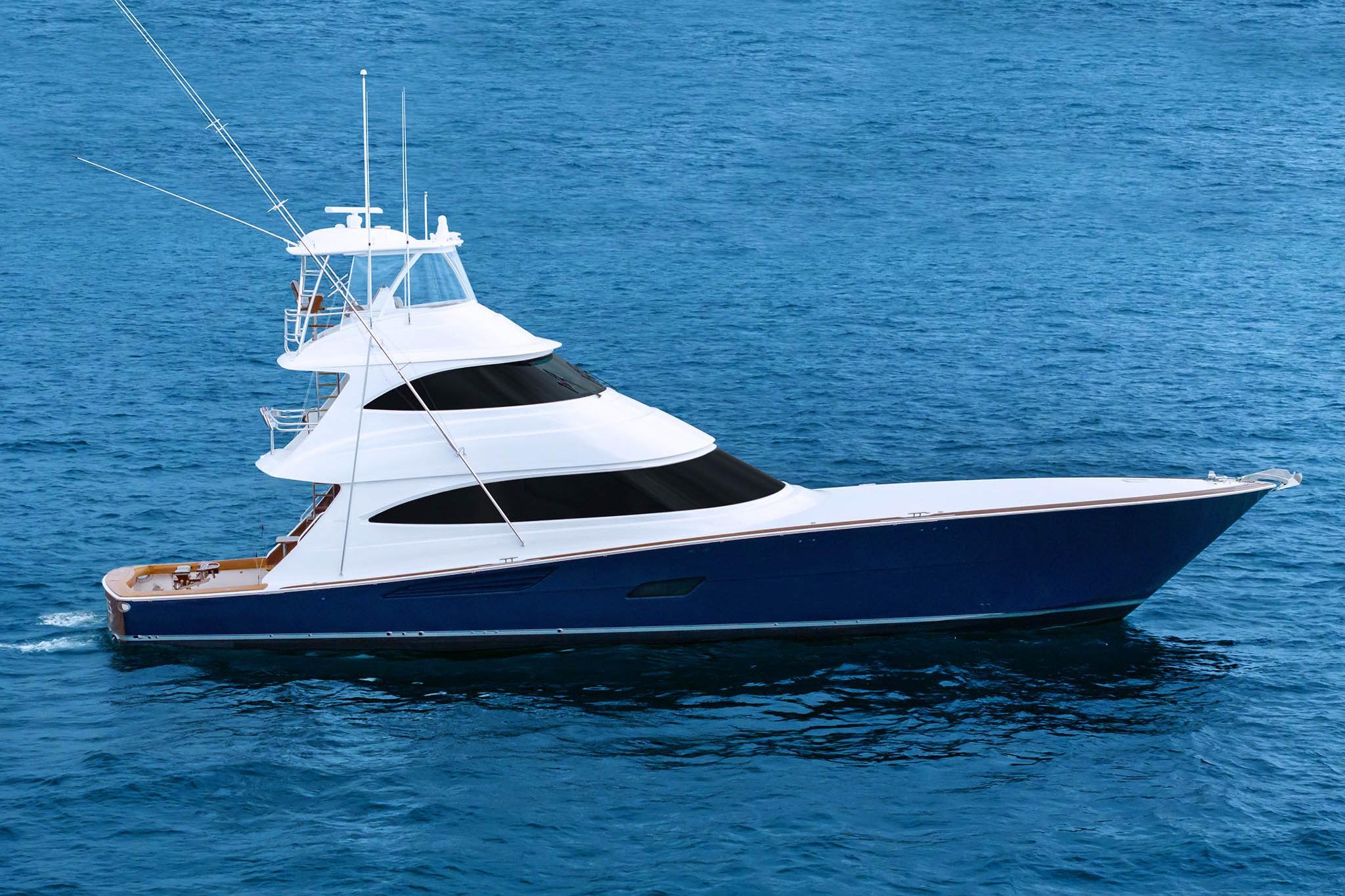 The all-new Viking 82 Sky Bridge delivers the ultimate blend of sportfishing performance and cruising luxury. Combining the command of a fully appointed enclosed bridge with the visibility and versatility of an open sky bridge, this model satisfies both the competitive angler and the long-range traveler.