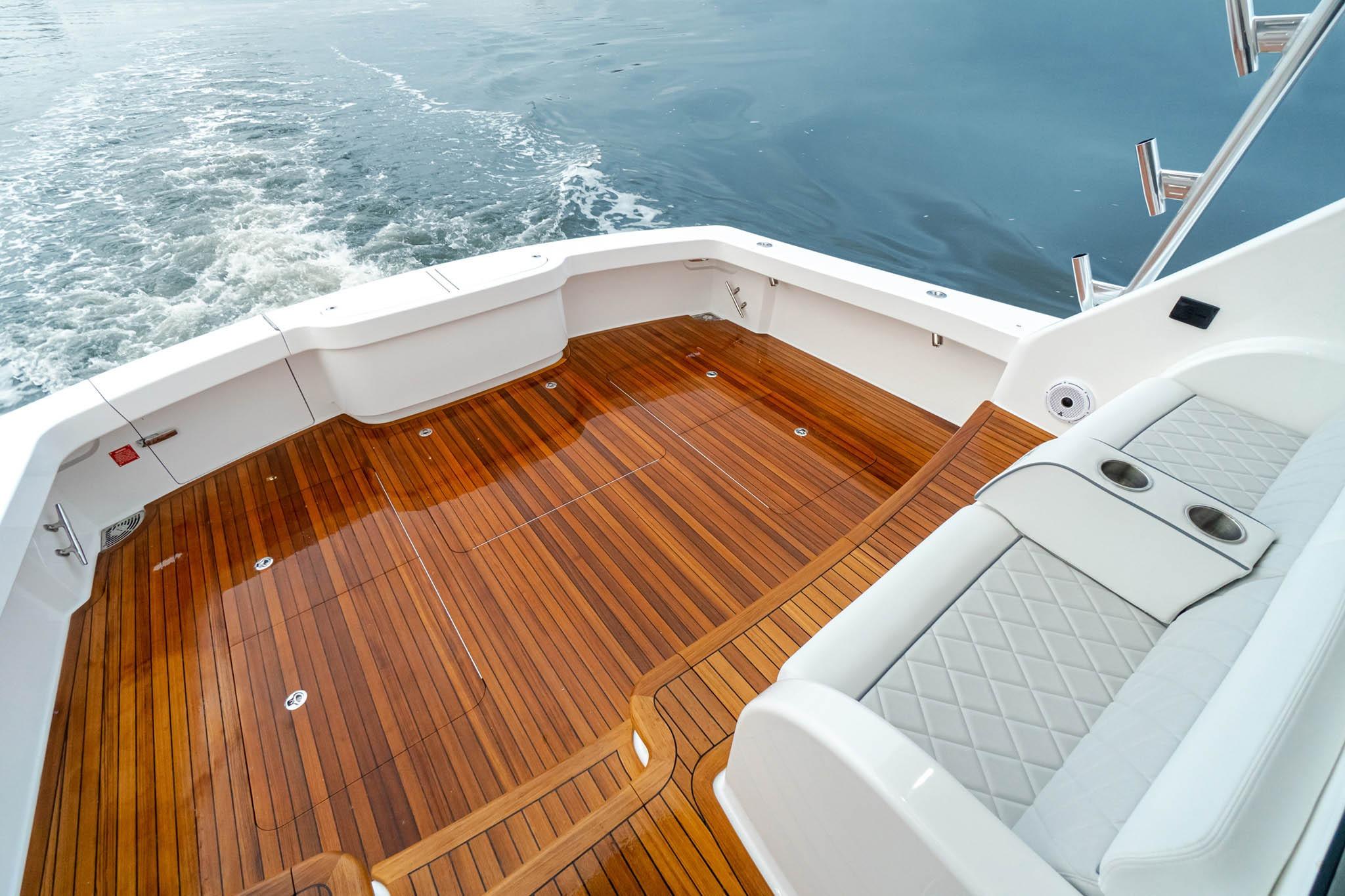 Below deck, Viking’s renowned craftsmanship is on full display — from the high-gloss teak joinery to precision-fit cabinetry and premium materials. Every detail reflects the brand’s commitment to blending durability with luxury in a yacht built to perform offshore and entertain at the dock.