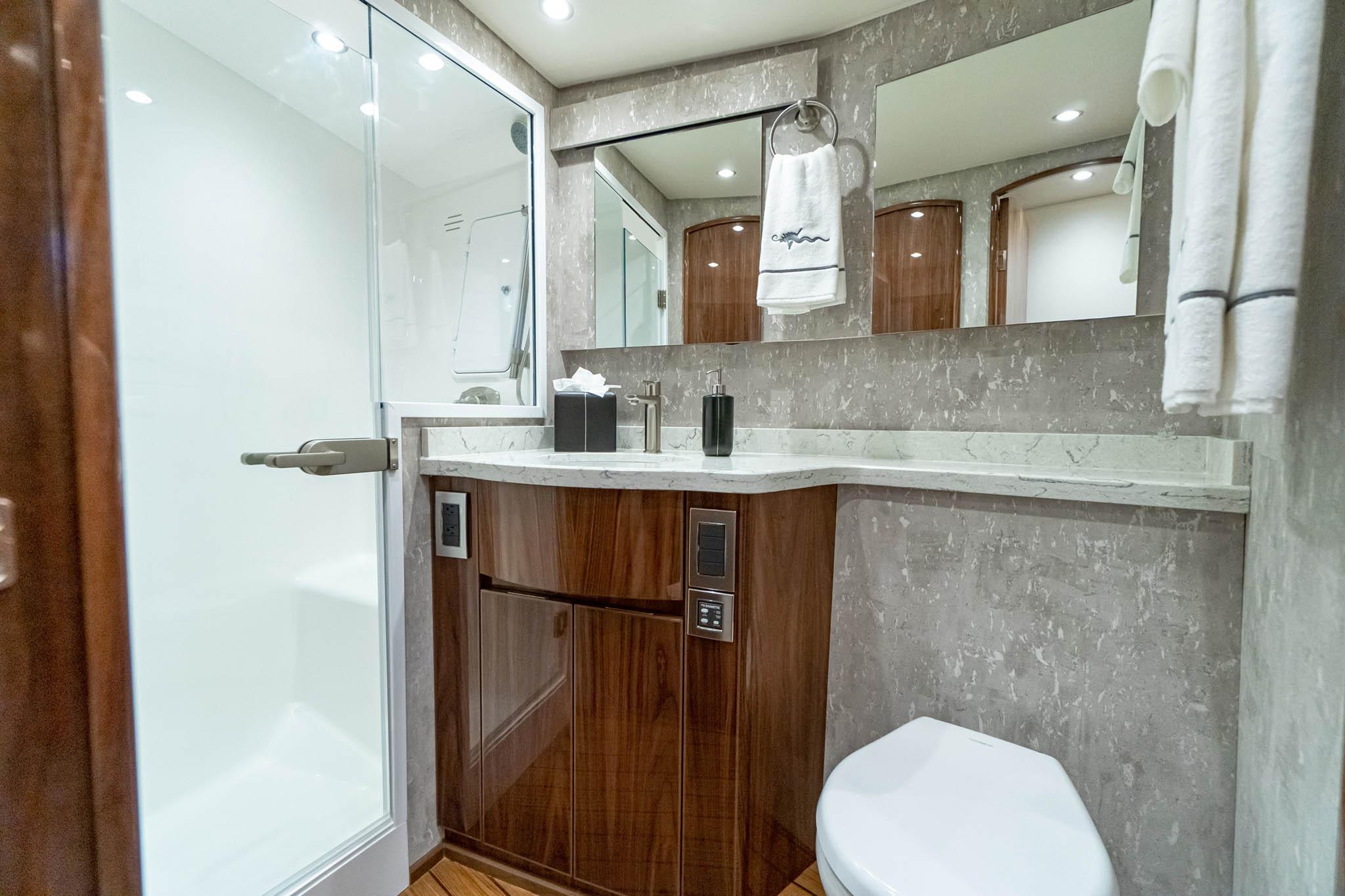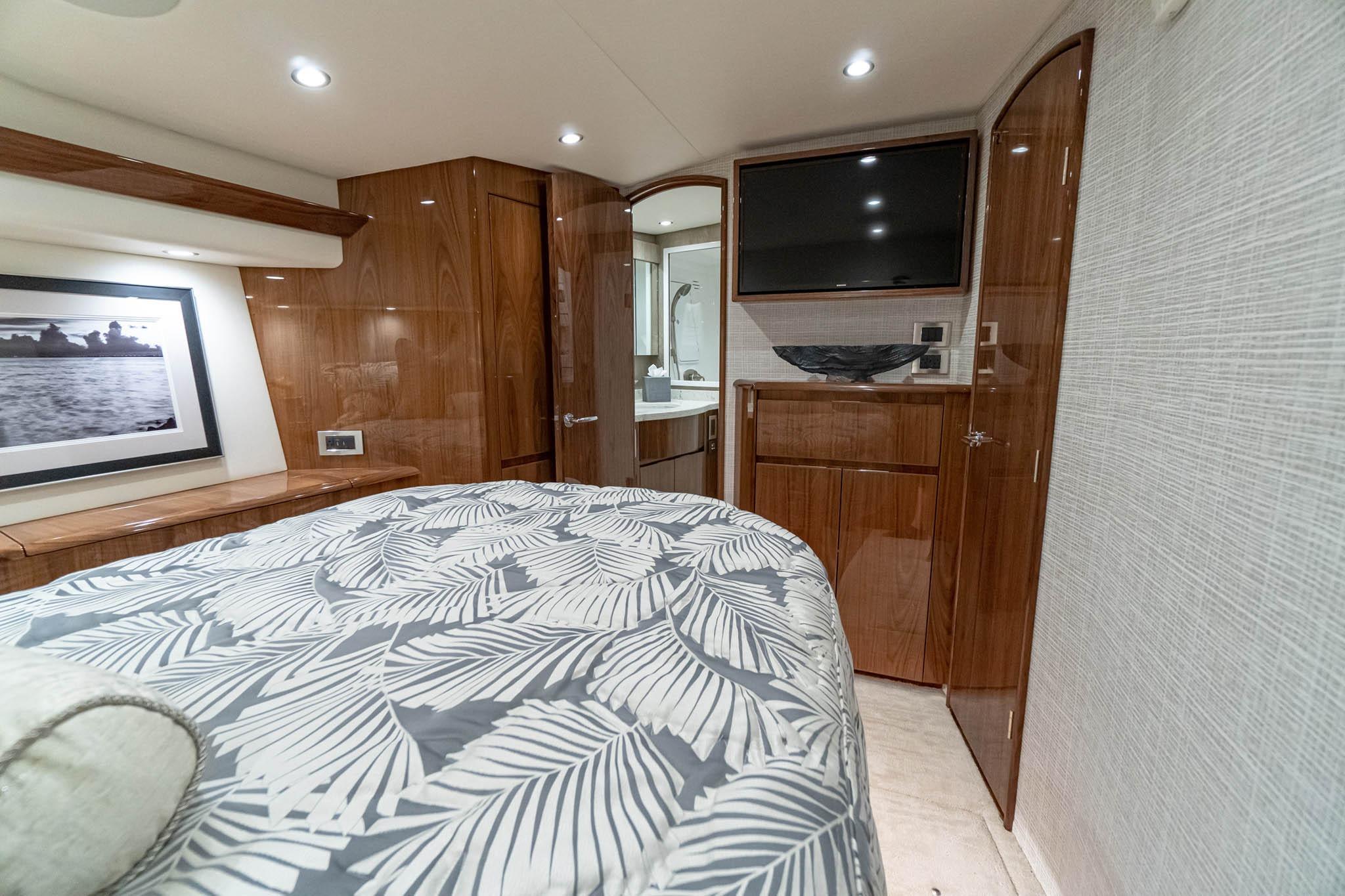 Forward VIP Stateroom: A spacious forward cabin offers a queen island berth, overhead storage, and private access to the starboard head and shower for guest privacy.