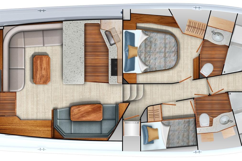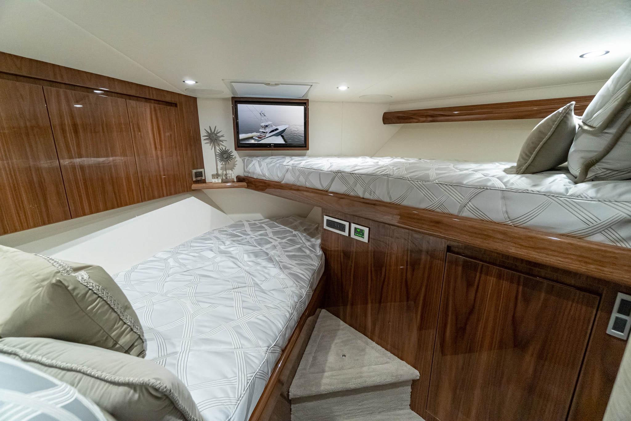 Guest / Crew Stateroom: The third stateroom to starboard can be configured as upper and lower bunks or a single berth with additional cabinetry and storage, providing flexibility for crew or family use.