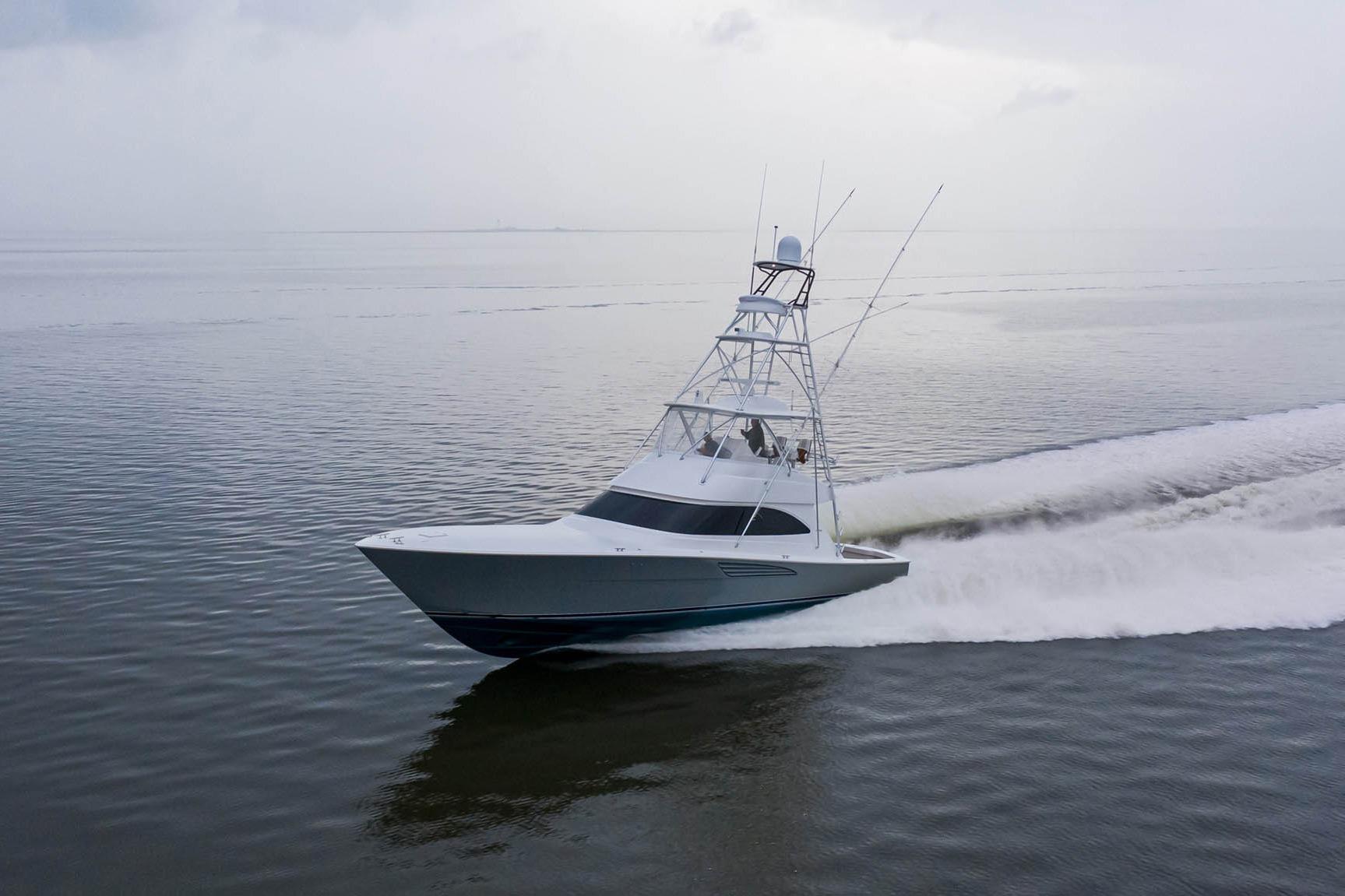 The Viking 54 Convertible features a resin-infused fiberglass hull with composite coring and carbon-fiber reinforcements for superior strength, stiffness, and reduced weight. Her optimized running surface provides a smooth, dry ride and excellent handling in a range of sea conditions.